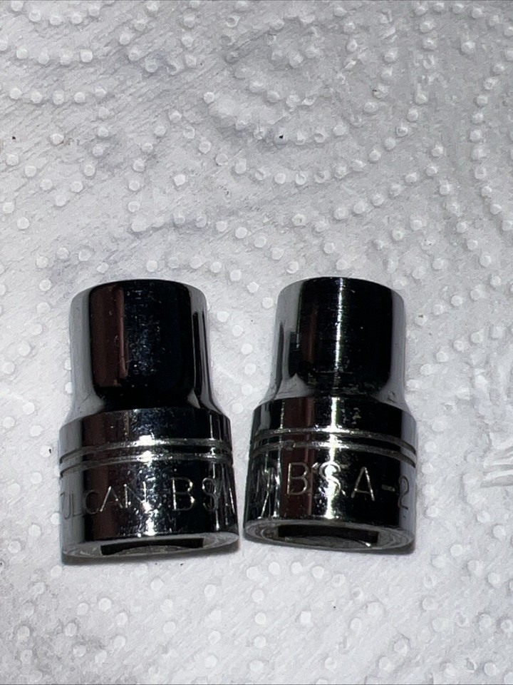 The NOS Vulcan Tools Lot includes two specialty sockets, BSA-1 and BSA-2, designed for a 3/8" drive. These standard sockets are manufactured in the United States with a chrome surface finish, making them durable and high-quality hand tools. The set does not come with a warranty, but it is a valuable addition to any automotive toolkit due to their unique specialty design and reliable construction.