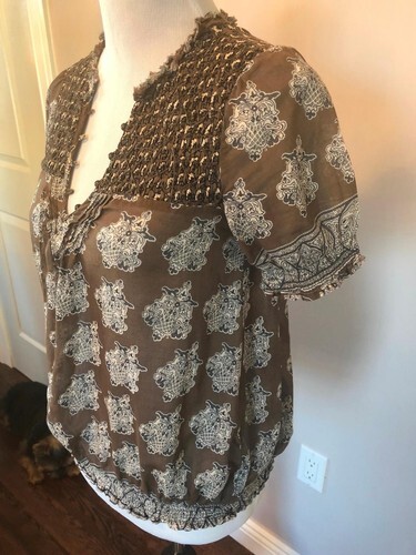 - NWOT JOIE Printed 100% Cotton Batik Taupe & Navy Printed Blouson Top SZ XS
