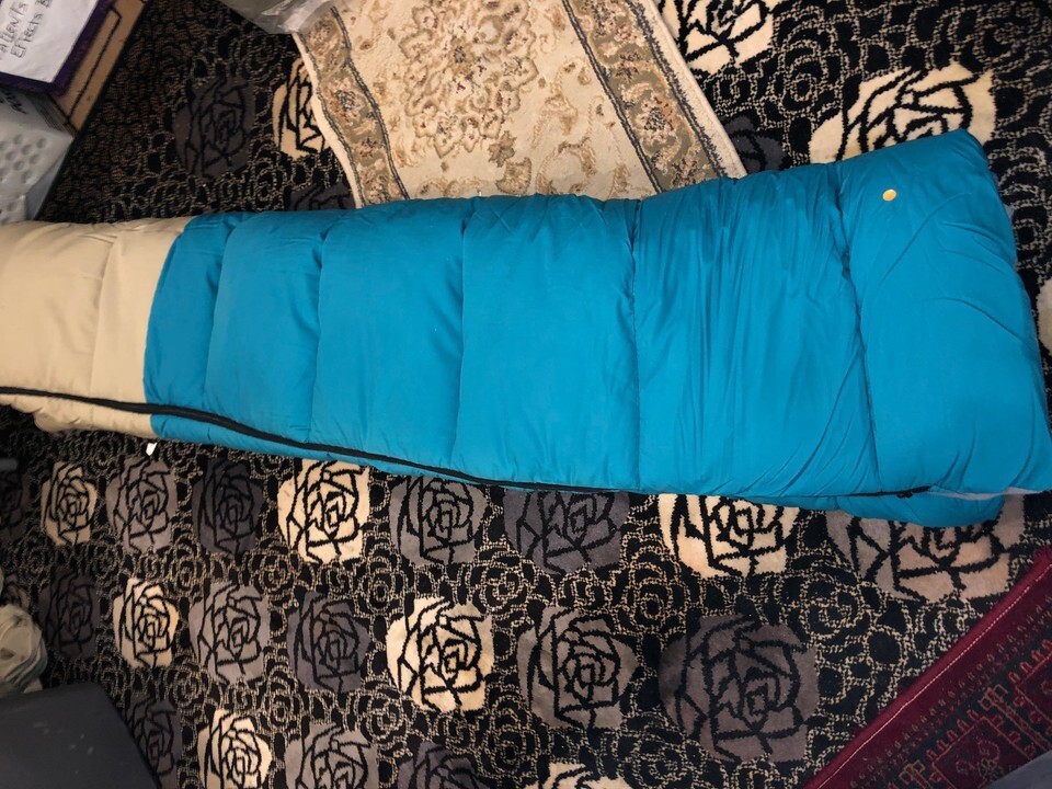 NWOTs Light Blue & Beige Adult Camping Size Sleeping Bag w/ Carrying Straps