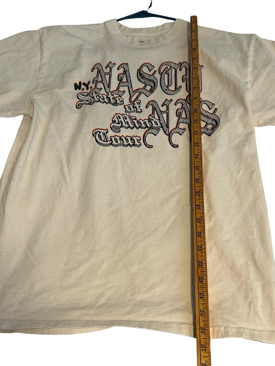 The product is a white double-sided Nas New York State Of Mind Tour 2023 T-shirt in size M. Made of cotton, this regular fit T-shirt features a solid pattern with an off-white color. The short sleeve shirt is machine washable and has a crew neck neckline, making it suitable for summer, fall, and spring seasons. The T-shirt showcases music, band, 90s, retro, and hip hop themes, perfect for fans of Nas and collectors of music-inspired apparel.