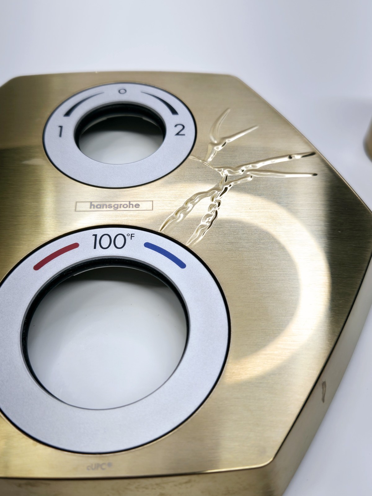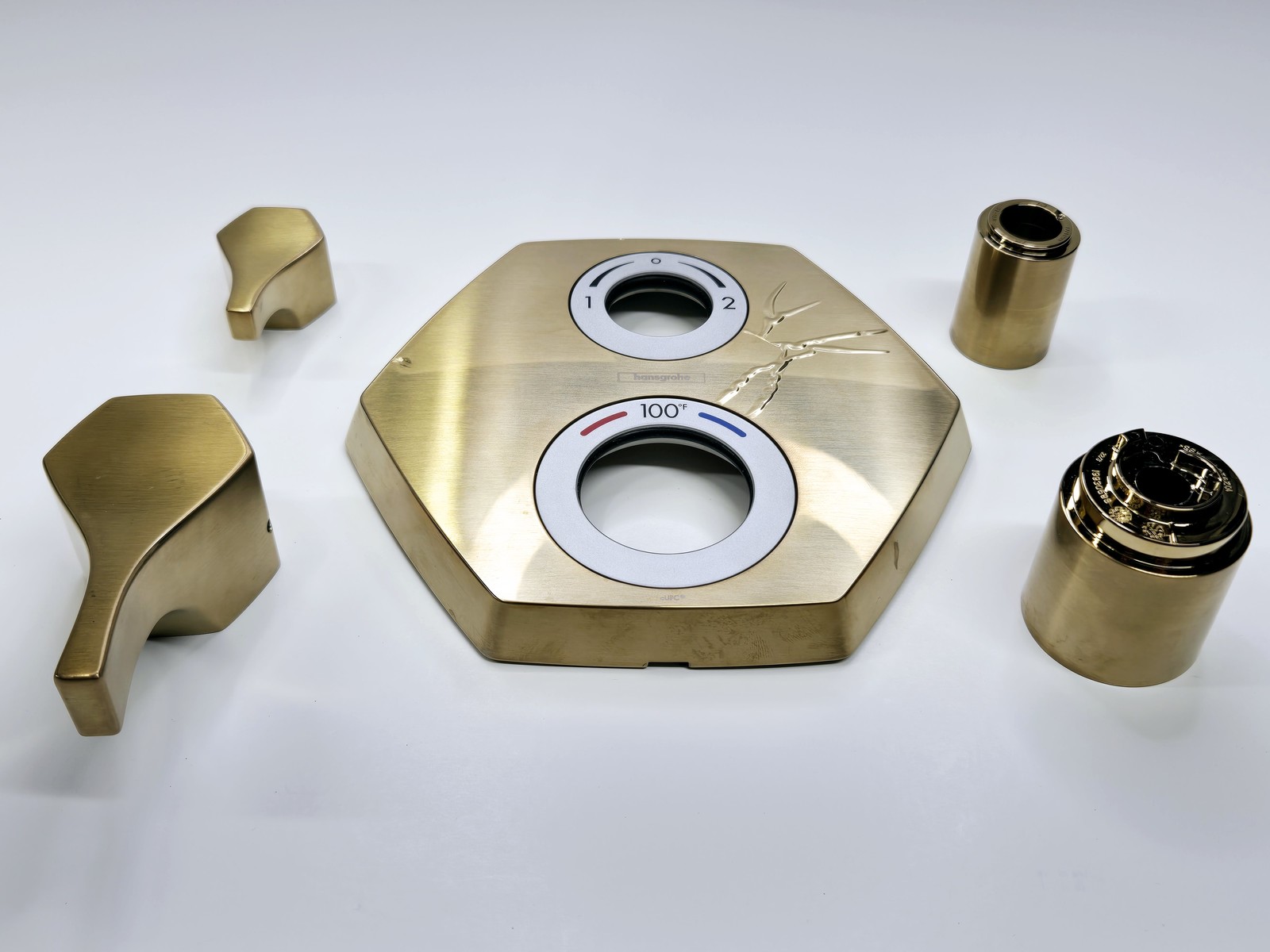 Built to last: Brass internal components compliment a polymer trim plate for a surface that is resistant to dents, chemical corrosion, and mineral accumulation