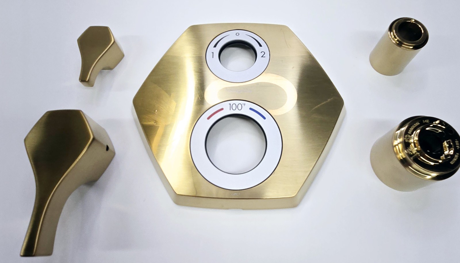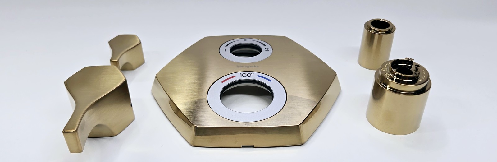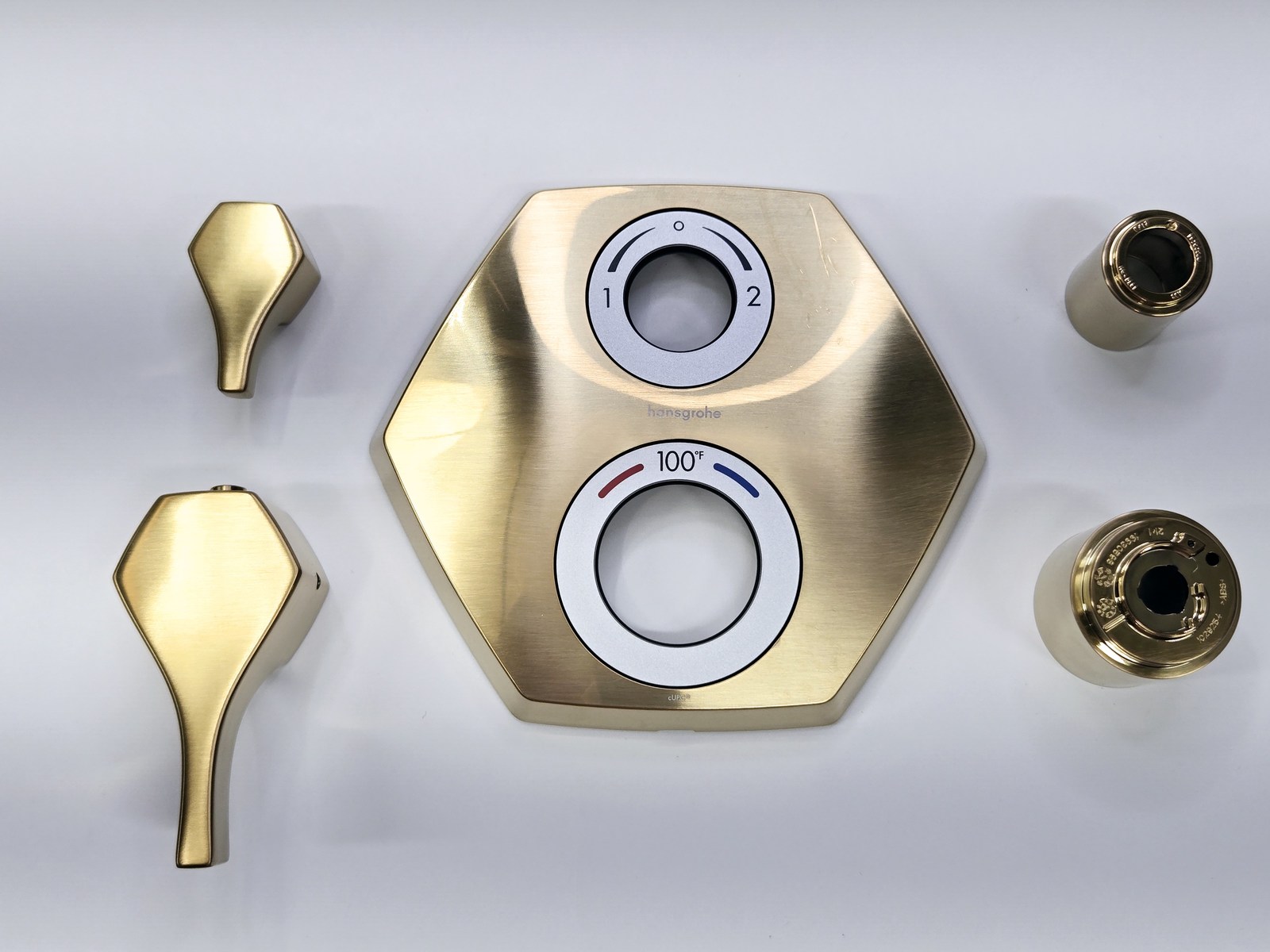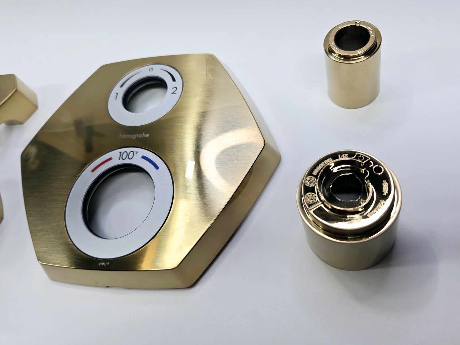 Built to last: Brass internal components compliment a polymer trim plate for a surface that is resistant to dents, chemical corrosion, and mineral accumulation