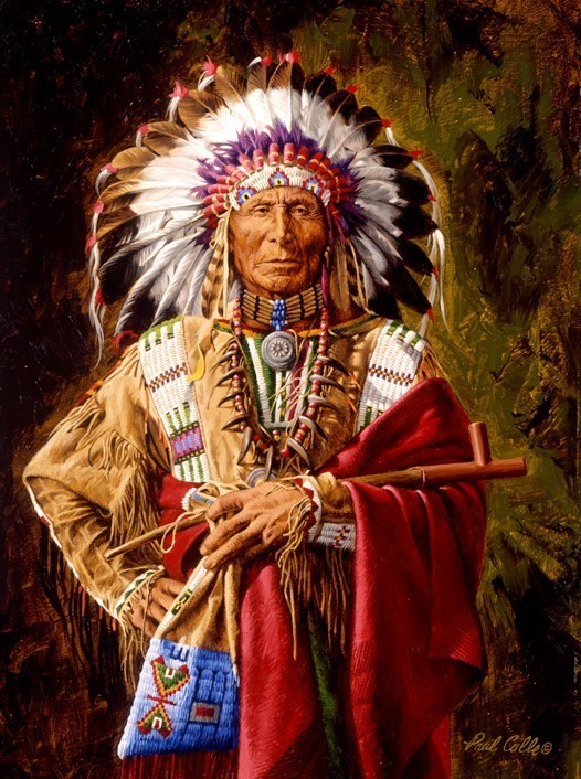 Native American chief adorned in a traditional headdress, standing with dignity and grace.