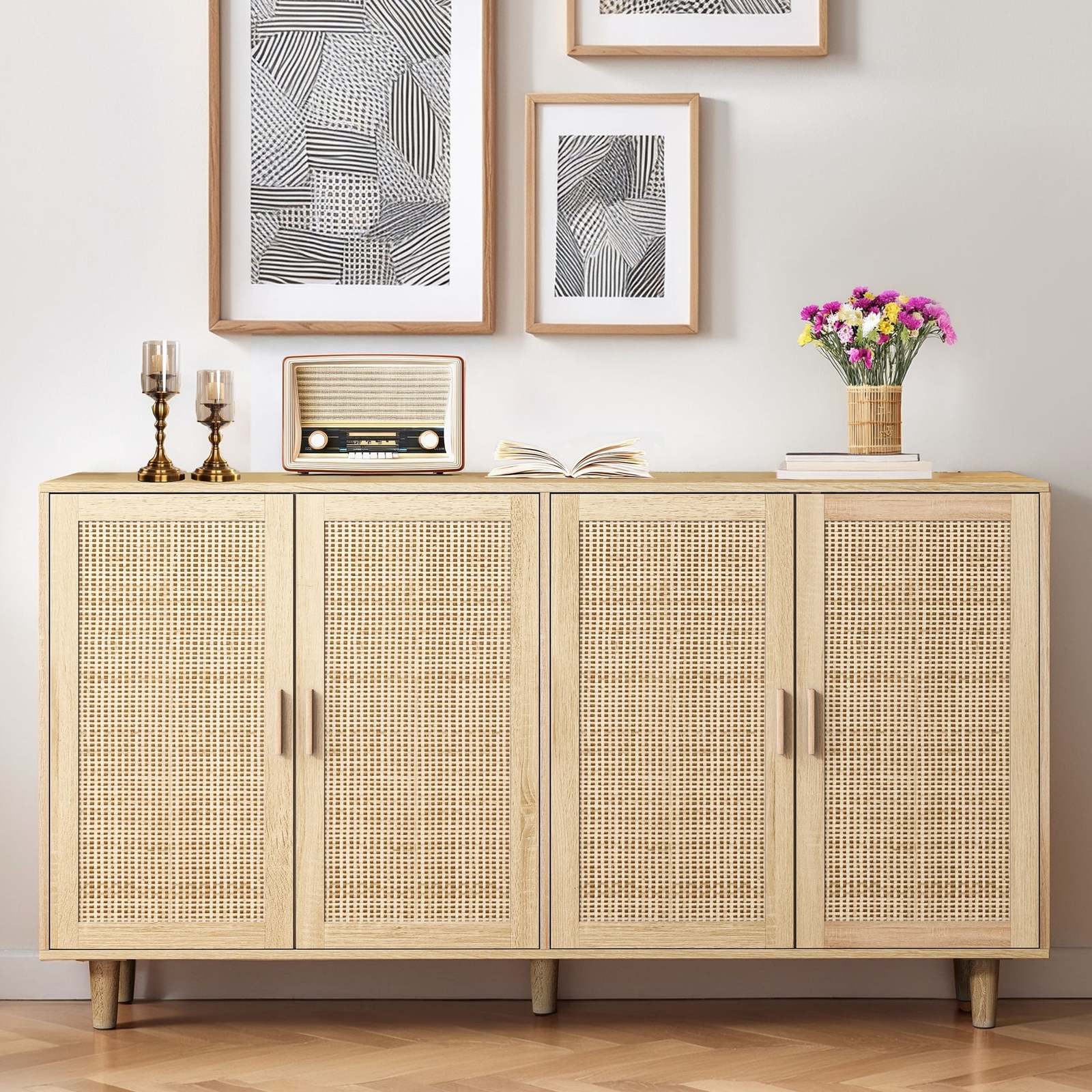 - Natural 4-Door Rattan Storage Cabinet for Bedroom Living Office