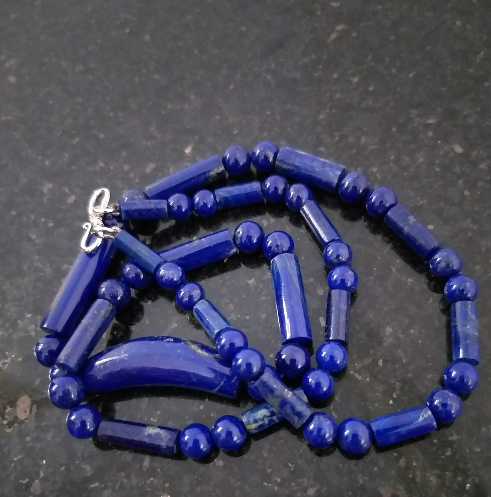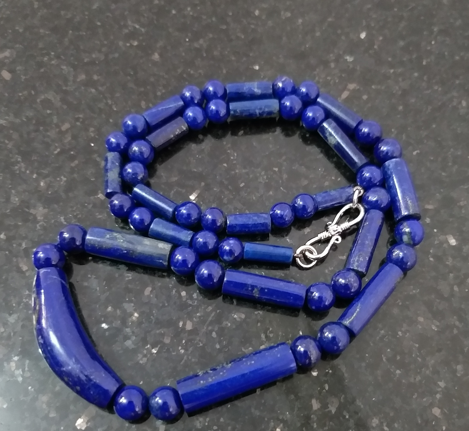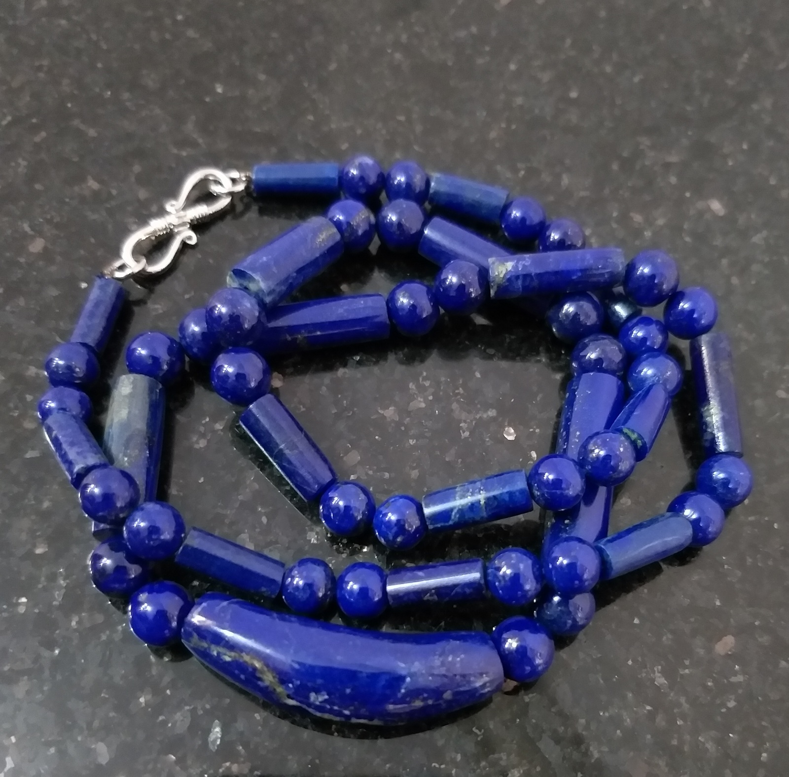 Natural fancy shape Lapis necklace has custom cut barrels and spheres, the lapis beads vary from 6.5 inches to 7.5 inches in size also the barrles vary from 4MM by 10MM to 7MM by 22MM.