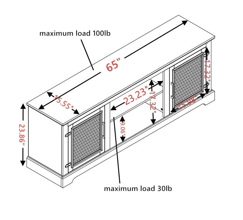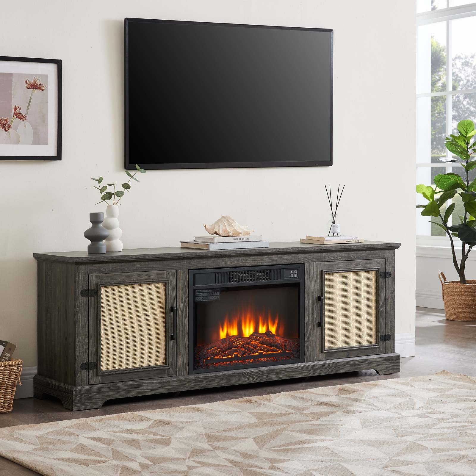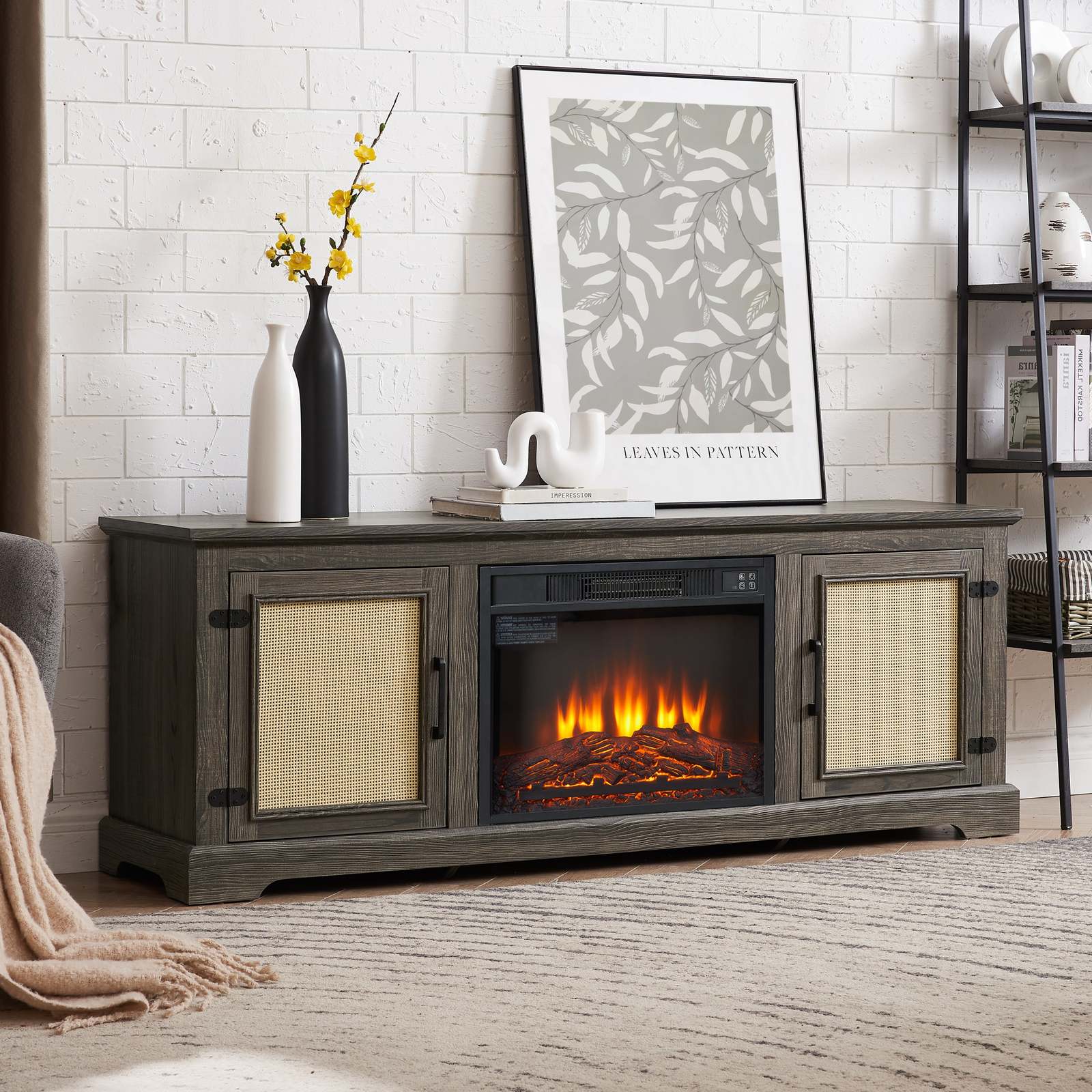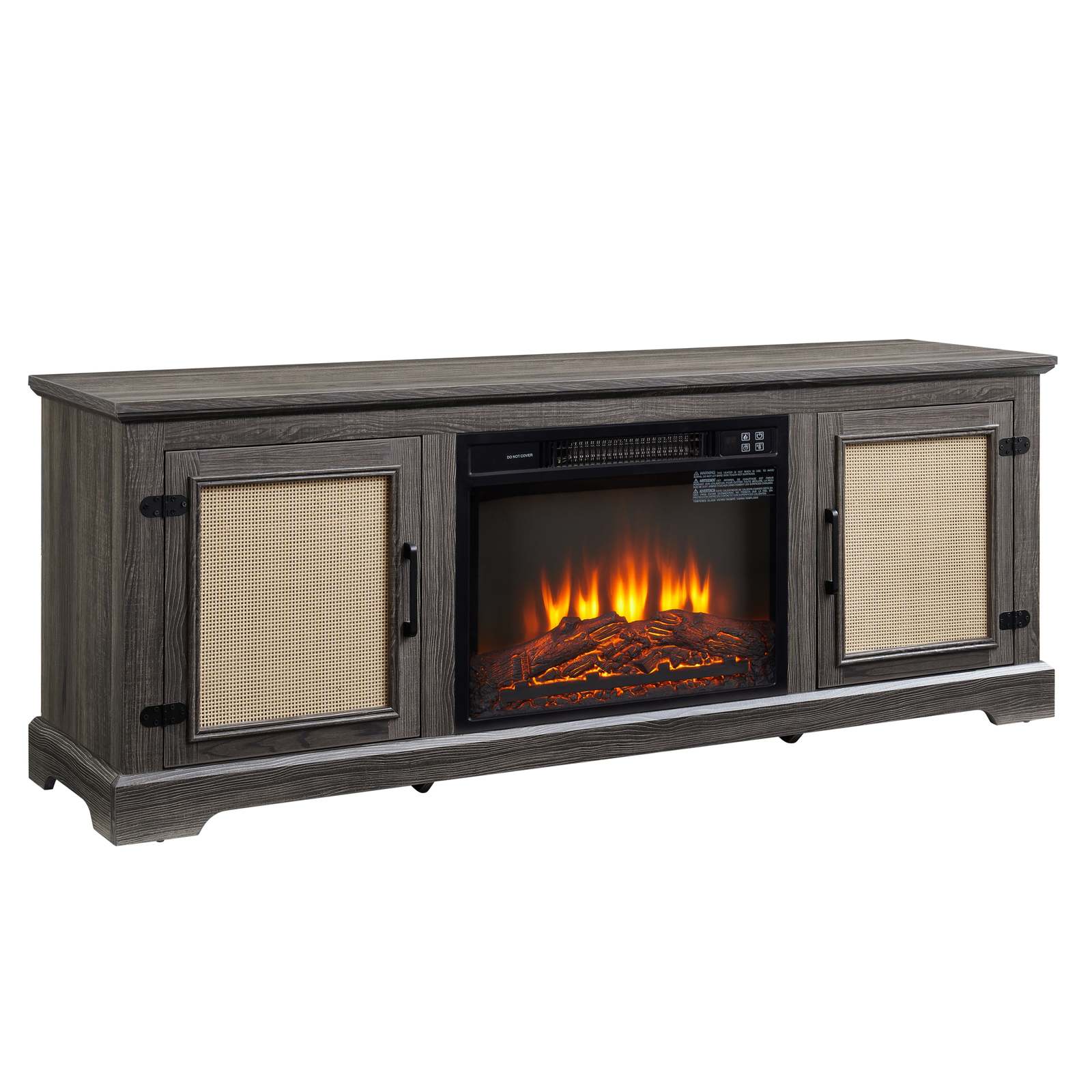TV Stand Dimensions: 65'W*15.55'D*23.86'H Largest TV Size: 65'' Body Color: Grey Material: MDF + PB Number of Cable Management Cutouts: 6 Number of Adjustable Shelfs: 3 Fireplace Power Rating: 1,400 W / 4,777 BTU Temperature Setting: 62?to 82? Fireplace Timer Setting: 30 minutes ? 6 hours Flame Brightness Levels: 3