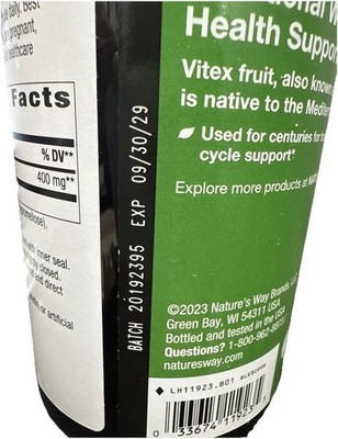 About the product: Description: Nature's Way Vitex Fruit 400mg 100 Caps Support of Female Cycle Ex.09/30/29 Product Details: Nature's Way Vitex Fruit 400mg 100 Caps Support of Female Cycle Ex.09/30/29 Store Policies: Handling We will ship all orders within 1 business day of payment. Payment must be received between 3 days of the end of the transaction. We accept the following type of payments: all major credit cards, PayPal and payment upon pick-up. Delivery Please note that express or priority mail only applies to transit time, it does not rush your order. International orders over $25 will require insurance. Return Policy We guaranteed our products for a full refund up to 5 days after customer receives the item(s), if the item(s) is not exactly as described and pictured, shipping charges are non refundable. Items described as irregulars are final sales, AS IS, no refunds/returns. Any refund(s) are only for the amount of purchase minus 15% for restocking fee. Returned item(s) must be in the exact same condition, any damages or any kind of alteration to the product have to be notify and agreed upon by us before return is made. Feedback We take our reputation seriously, we buy and sell online, so we understand the value of trust. If you are unsatisfied with your order, please contact us and we will work with you to resolve it to your satisfaction.