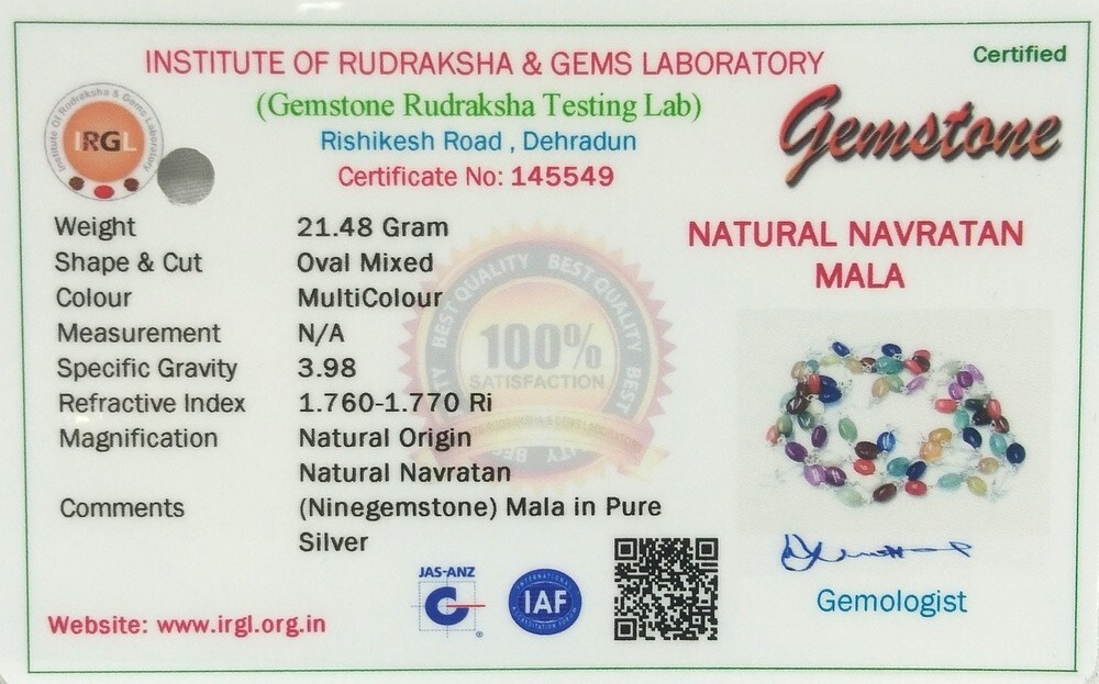 Navratna Mala / Neun Edelstein Mala In Reinem Silber - Laborzertifiziert