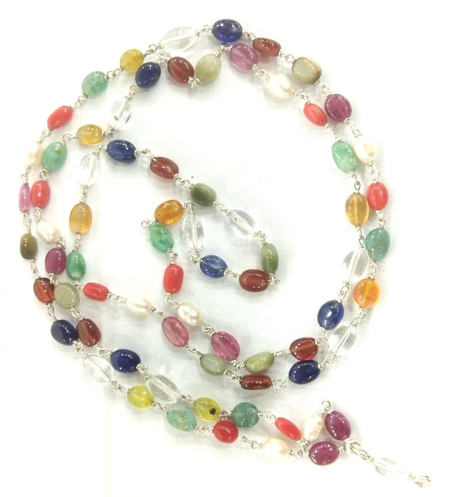 Design : Diese wunderschone Navratna Mala besteht aus reinem Silberdraht mit geknoteten Stil mit ovalen Edelsteinen mit ovaler Form - roter Koralle, gelber Saphir, blauer Saphir, Perle, Katze Auge, Gomed, Kristall (Sphatik), Emerald und Rubin.