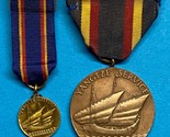 The bronze medallion features a Chinese junk asail. The inscription above the ship reads ?YANGTZE SERVICE.? The reverse side depicts a left-facing eagle perched on an anchor, and text reads ?UNITED STATES NAVY? and ?FOR SERVICE.? The ribbon is dark blue with two sets of red and gold stripes.