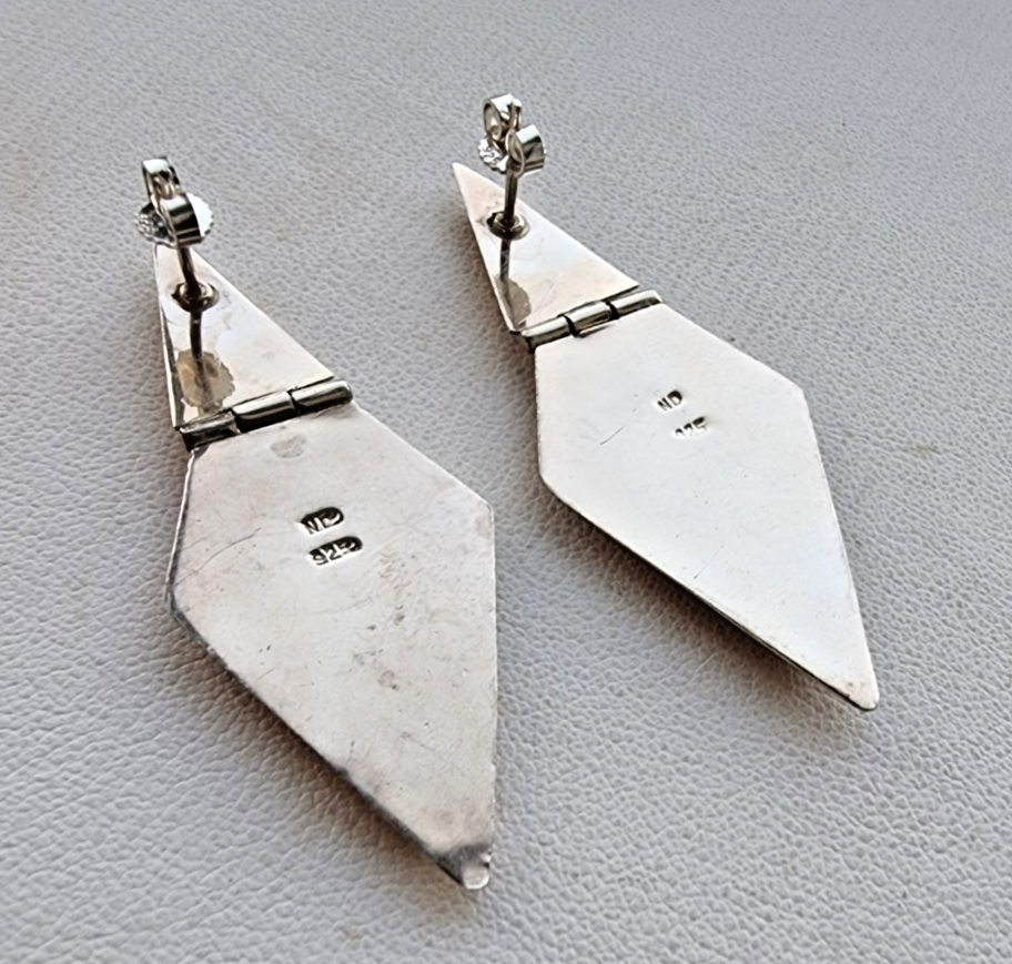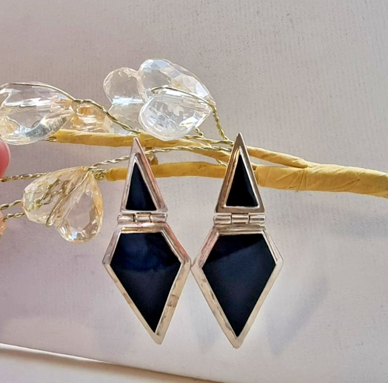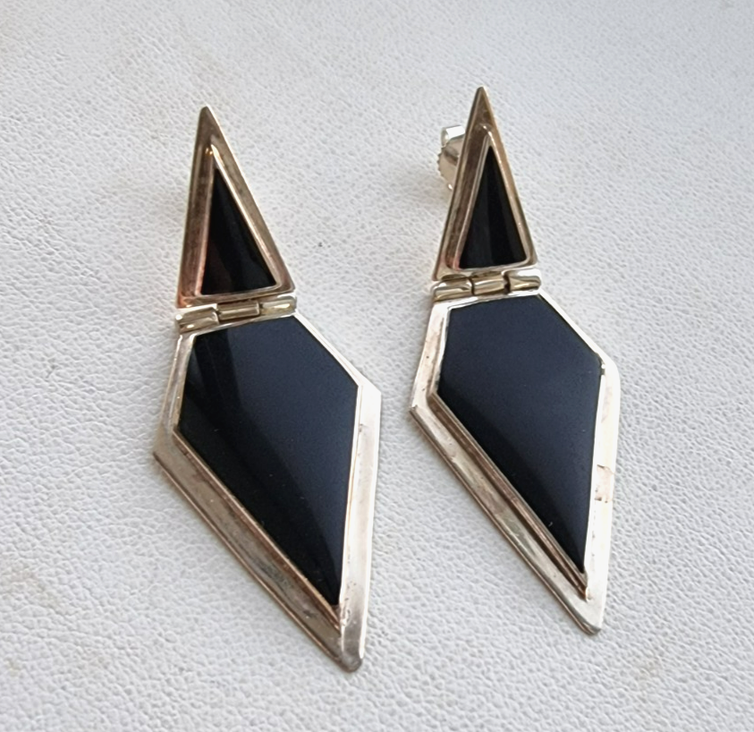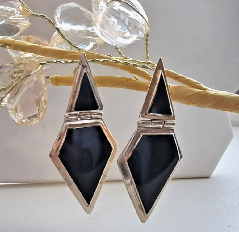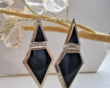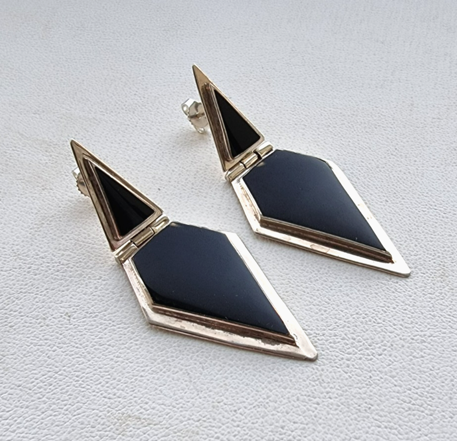 ND 925 STERLING SILVER BLACK ONYX DANGLE DIAMOND SHAPED EARRINGS