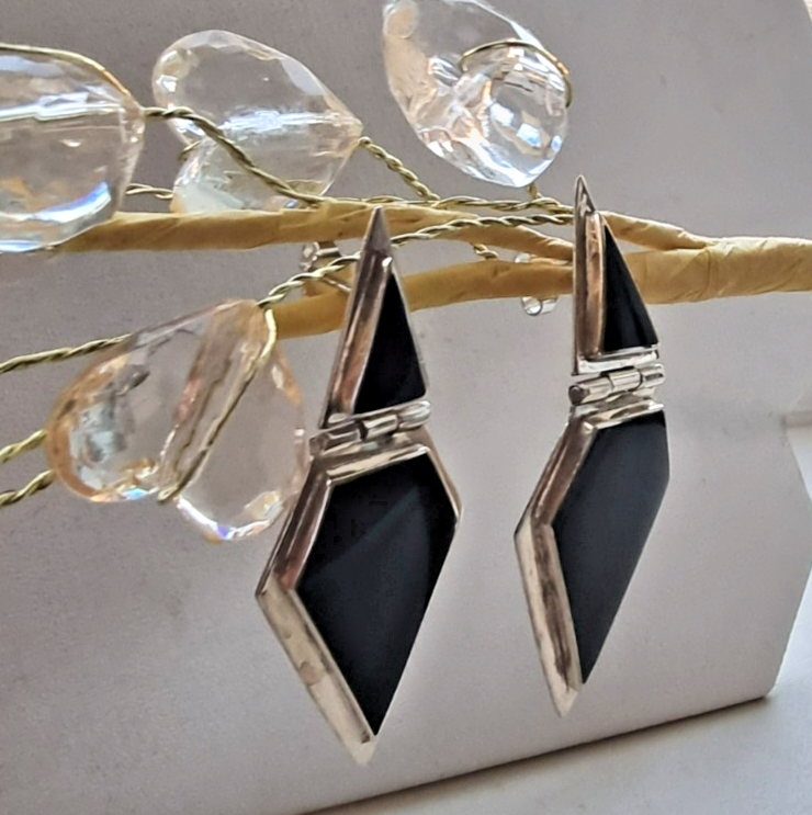 - ND 925 STERLING SILVER BLACK ONYX DANGLE DIAMOND SHAPED EARRINGS