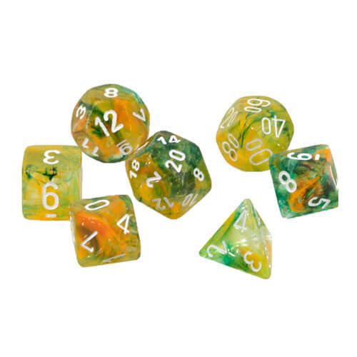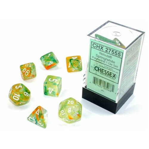 Chessex Nebula - Set of polyhedral dice with white light Includes 4, 6, 8, 10, 10 (decenes), 12 and 20 sided dice The dice have a glow-in-the-dark effect