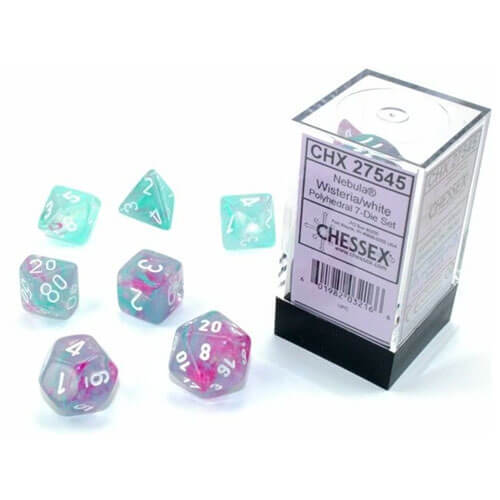 Chessex Nebula - Set of polyhedral dice with white light Includes 4, 6, 8, 10, 10 (decenes), 12 and 20 sided dice The dice have a glow-in-the-dark effect