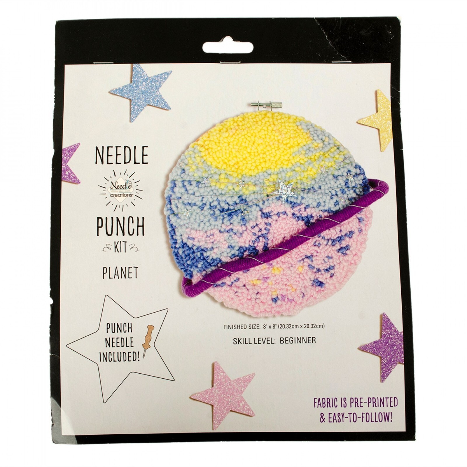 Needle Creations Planet 8 Inch Punch Needle Kit. Fabric is pre-printed and easy-to-follow. Kit Includes: 100 Percent Acrylic Yarn, 100 Percent Cotton Aida Fabric with Printed Design, 8 Inch Locking Plastic Embroidery Hoop, Punch Needle, Needle Threader, Metallic Silver Thread, Miscellaneous Embellishments (Beads and Stars), Needle, Rope for Planet Ring, and Easy-To-Follow Instructions. Skill Level: Beginner. Finished Size: 8 inches x 8 Inches. CHK-NC-PNND-PLANET8