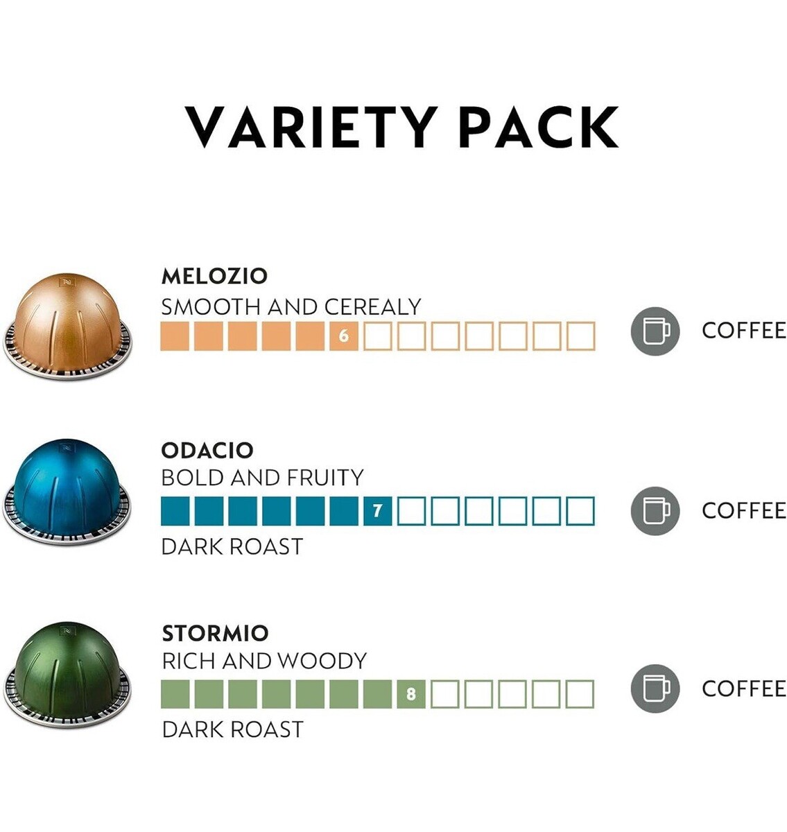 Nespresso Vetruo Line Variety Pack Assortment. Medium and Dark Roast. 30 Capsules. 10 capsules of each of the following flavors: Odacio, Stormio, Melozio. Each Brews 7.8 oz. BULK/LOOSE lot