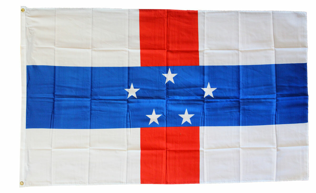 Our 3' x 5' Netherlands Antilles flag includes vivid colors and an accurate design screen-printed on a durable 100% polyester material. The flag features a white fabric header with two brass grommets on the 3' side for easy display. The flag is best used indoors but can withstand occasional outdoor use. The authentic design is based on information from official sources.