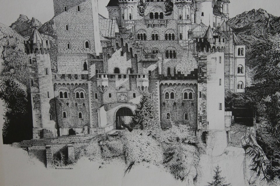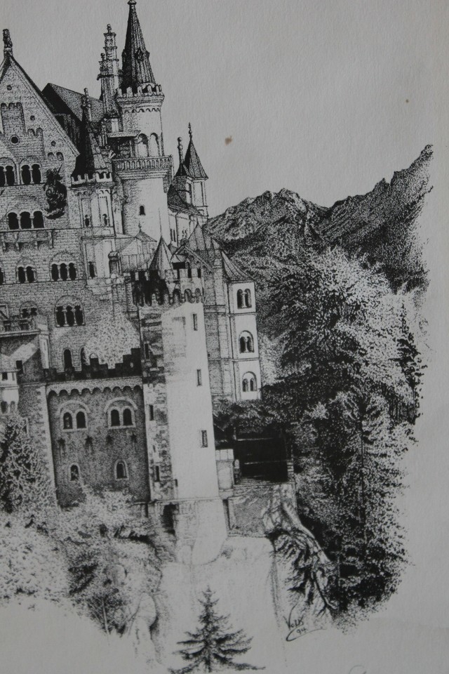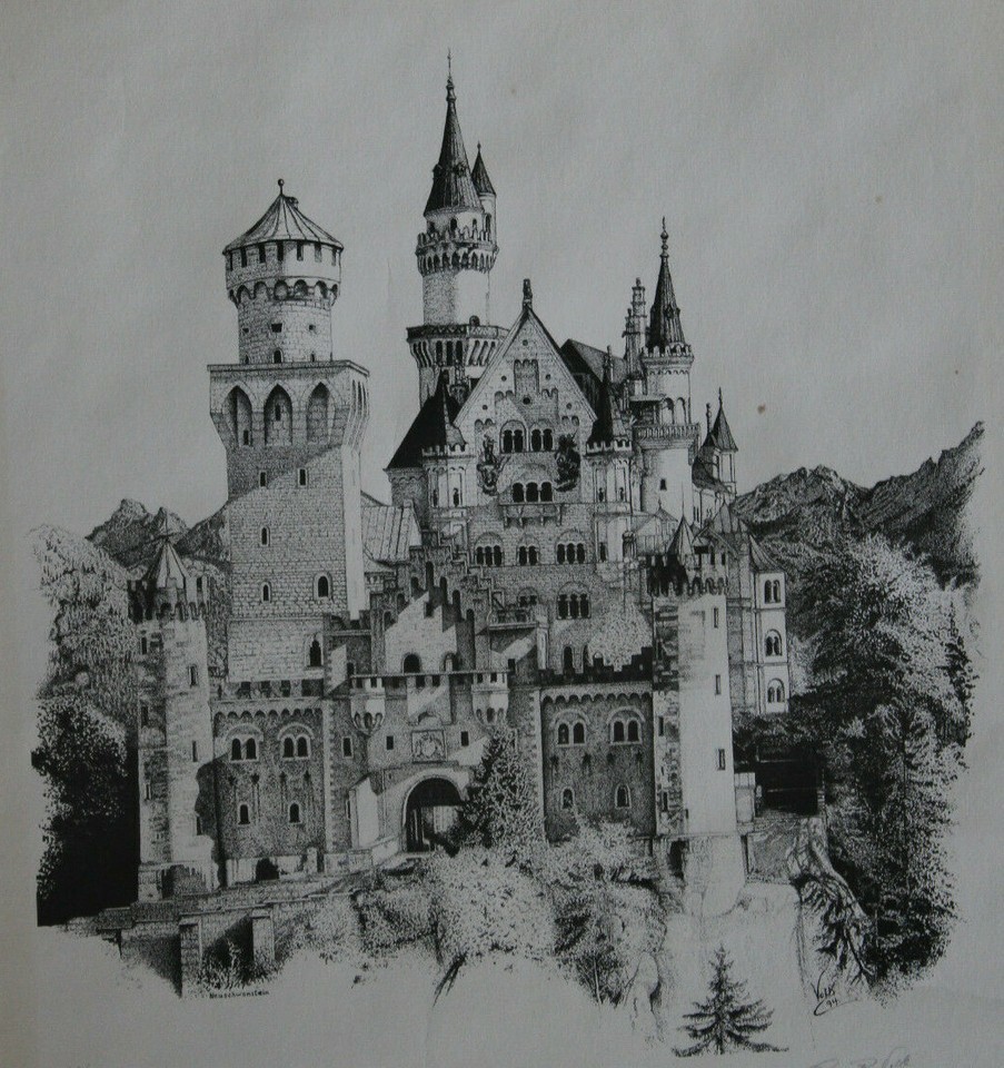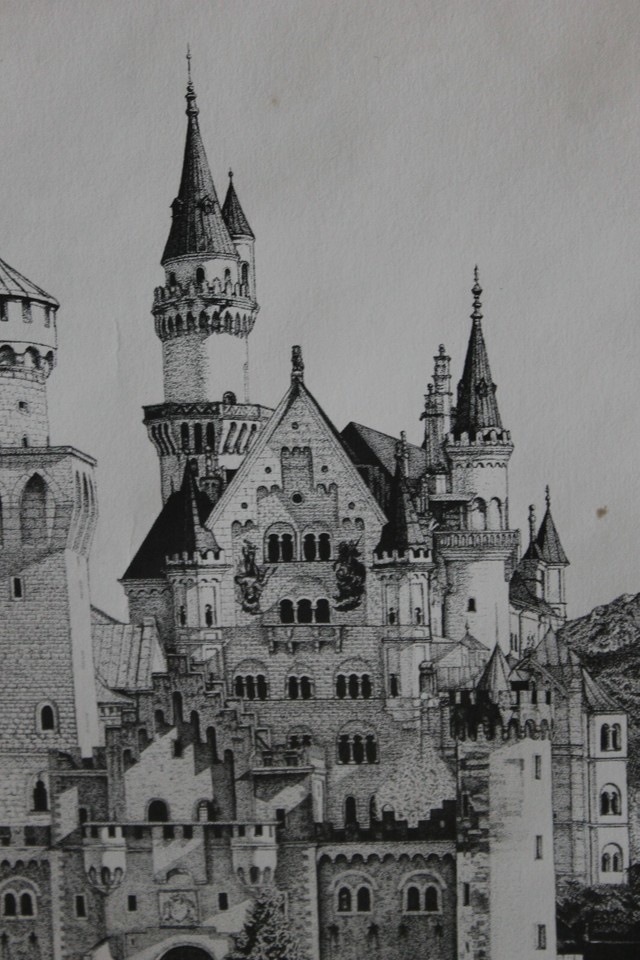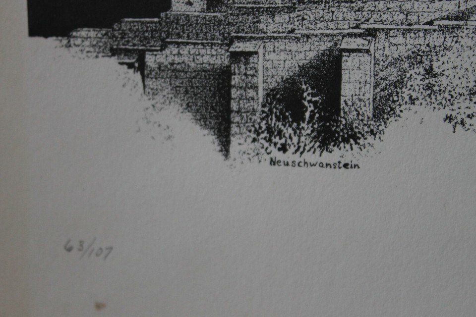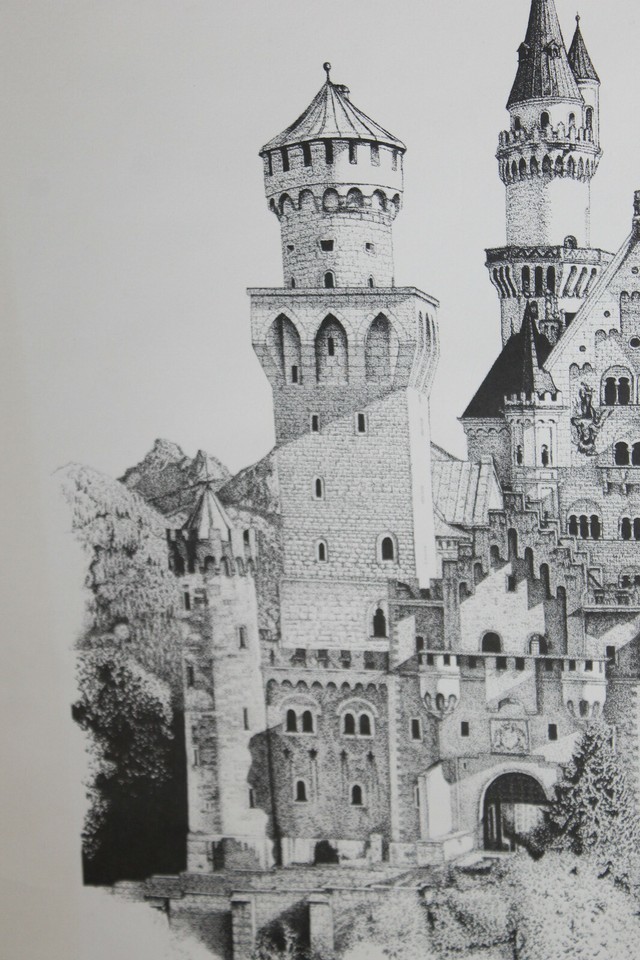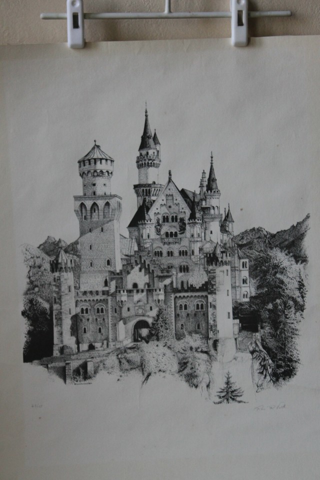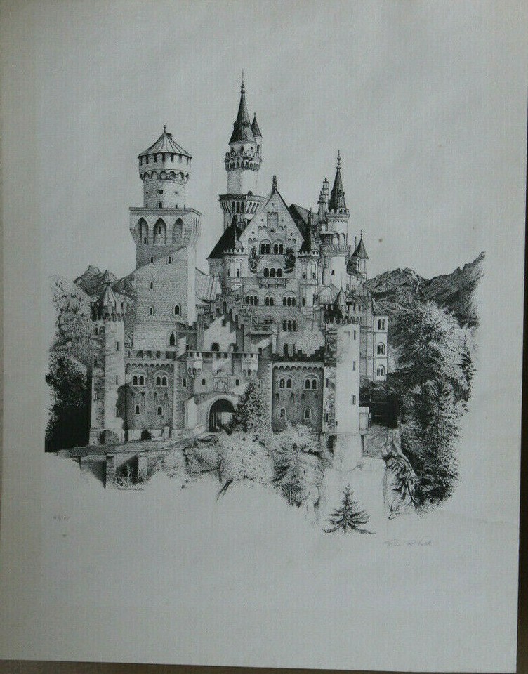 NEUSCHWANSTEIN CASTLE BAVARIA GERMANY Signed Ron R. Volk 94. A limited edition # 63/107 Sepia black white art print. Measures 25" tall x 19" wide.Print does have ware some ware from age but still a very cool print. please see photos as part of the discription