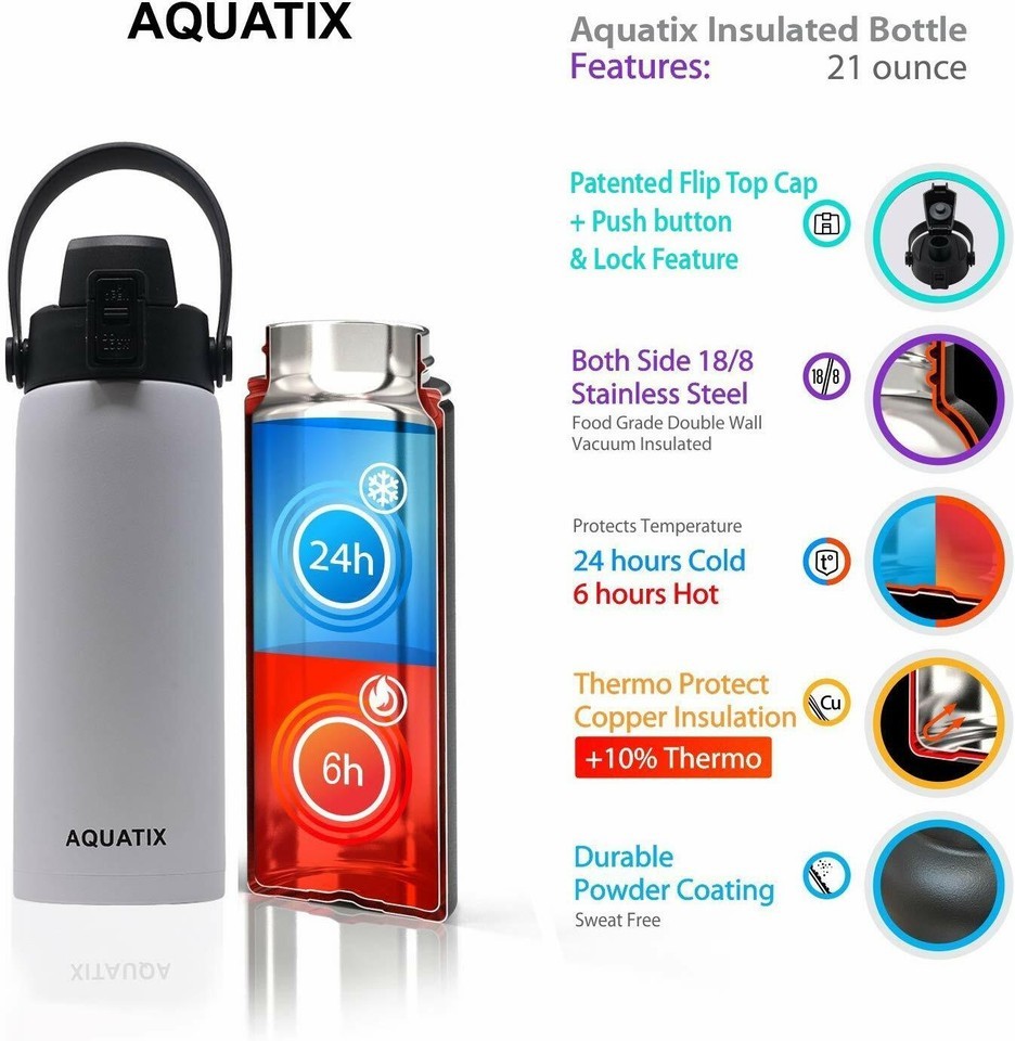 end_display_feedback_code_window Best Stainless Steel Water Bottle Or Your Money Back! - If Our 100% Pure Stainless Steel Sport Water Bottle (with No Plastic Lining Or Dangerous BPAs) Isn't The Best Sport Bottle you have ever tried we will Give You All Your Money Back! 100% GUARANTEED!!! KEEP DRINKS COLD FOR 24 HOURS, HOT FOR 6 -Our double-walled vacuum insulation technology keeps your drinks ice cold up to 24 hrs and toasty warm up to 6 hrs. Enjoy cold beverages all day long at work, during those long events, or at the beach! Engineered To Stay Dry Not Leak - Our 21 oz Bottle Has Been Specially Engineered To Stay Dry And Not Leak. Stop Worrying About Liquids Sweating In Your Bag Or Purse, Our Bottle Is The Answer! 100% Pure 'true' Stainless Steel - Keep Drinks Cold 24 Hrs, Hot 6 Hrs don't Be Fooled By Imitators! Our Bottle Is Toxin-free, Food Grade Stainless Steel On Both Inside And Outside Walls! You Won't Have To Deal With Rust, Leaking, Dents, Or Issues That You Will With Cheap Imitators! Wide Drip-free Mouth With Non-leaching Cap -you Won't Find A Stainless Steel Water Bottle With A Better Design Anywhere Else Online. Treat Yourself To A Product That Actually Works! Our Bottle Is Your Ticket To A More Pleasing Lifestyle! Convenient Flip Top Cap with Removable Strap Handle The Aquatix Sporty 21 oz Double Wall Insulated Stainless Steel Water Bottle is perfect for use at the gym, at the office, around your house and anywhere you need to take your beverage of choice with you. Made from durable and sturdy PREMIUM QUALITY, Top Chef 18/8 FOOD GRADE STAINLESS STEEL, this Aquatix Sporty 21 ounce water bottle is a great eco friendly sports bottle. The double wall insulated water bottle is PERFECT for carrying while walking, hiking, camping, use at the gym or just on the go- as it fits MOST car cup holders. No more spills and messes while driving! Ditch those plastic water bottles! GO HEALTHY with this BPA Free, FOOD GRADE stainless steel water bottle that holds a large capacity of liquids 21 fluid ounces and no longer worry about toxins and chemicals leaching into your beverage. Drink crisp, clean, healthy and refreshing drinks from Your Aquatix Water Bottle every time. Just Fill and Go! This sporty bottle features a flip top spout drinking mechanism allows the ease of staying hydrated even while on the go! The flip cap top provides single-handed drinking ability and is perfect for your busy life on the go! Stay hydrated and DRINK MORE WATER with this large capacity 21 ounce water bottle. Double vacuum insulated wall construction contributes to hot teas, soup, coffee or other blends being consistently hot for up to 6 hours. And, for cold water, smoothies, soft drinks, or anything you may need very cold, 24 hours of insulated confidence, guaranteed cold, period! The bottle will not "sweat", meaning it will not create condensation which may leave a "ring" of liquid on your expensive buried walnut side table. Easy to hand wash or clean, NO aftertaste after cleaning. COLD LIQUIDS or HOT LIQUIDS! This is a double wall insulated water bottle that is made of 18/8 food grade stainless steel water bottle! No other bottle has all the features of our Aquatix Sport Bottle!