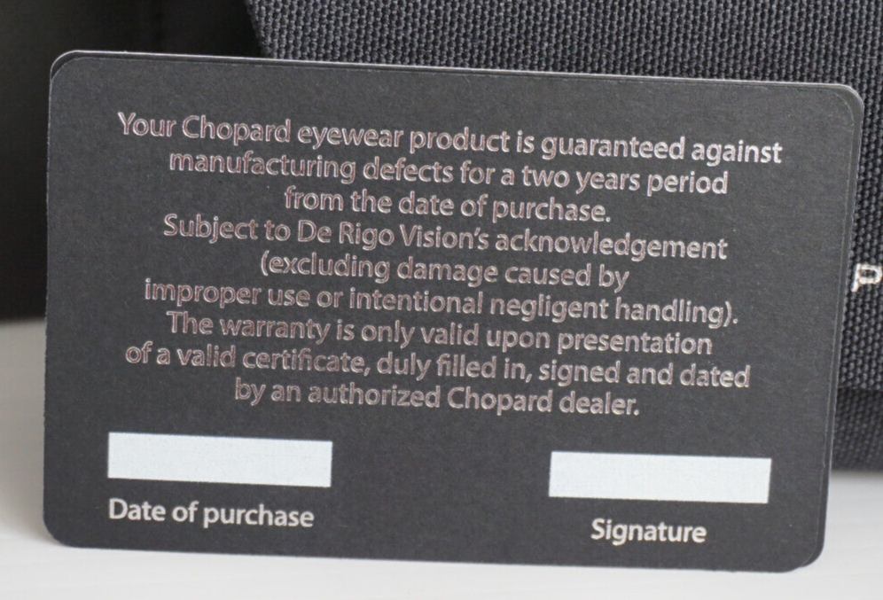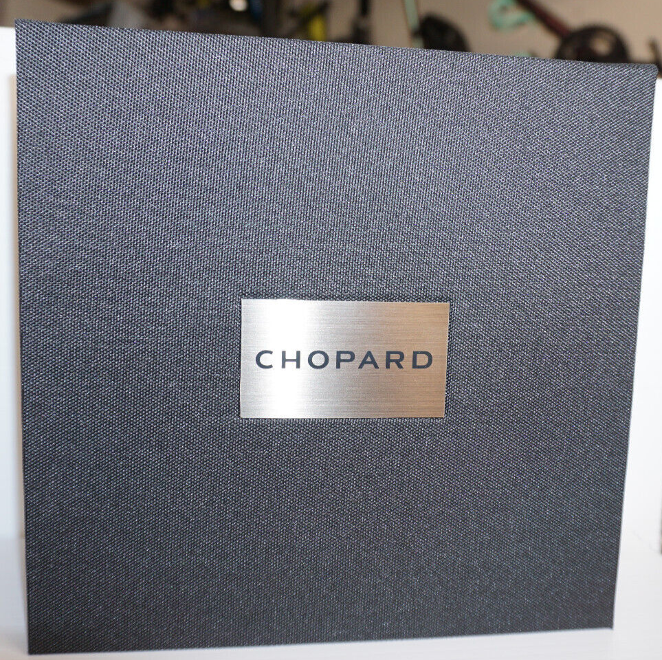 The original Chopard box, hard cover case, authenticity cards, and the Chopard microfiber cleaning cloth.