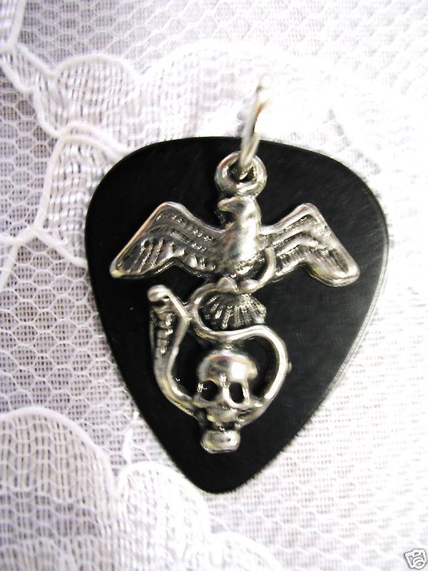It is a NEW - BLACK GUITAR PICK WITH A USA HAND CAST PEWTER SKULL - COBRA SNAKE EAGLE CHARM PENDANT NECKLACE