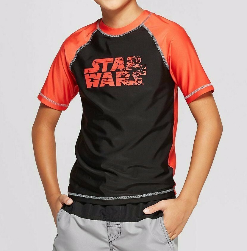 New Boys' Star Wars Black/Orange XS Rash Guard . XS fits 4/5. Really cool Rash Guard for the little Star Wars Swimmers. Regular price $14.99. Will ship in protective bubble wrap envelope. 1 business day of handling and 3-5 business days of shipping. Tracking included with envelope shipments and you will get within a week of purchase. Thank you for your interest in this item.