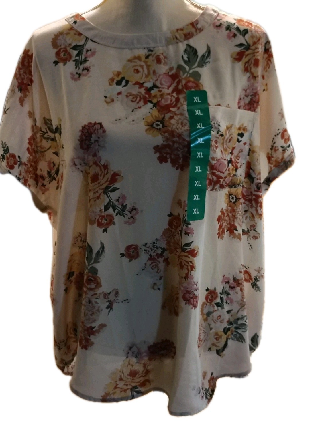New Buffalo Ladies' Short Sleeve Blouse with a front pocket in XL size is a stylish and comfortable option for casual occasions. The floral pattern and multicolor design add a touch of femininity, while the polyester material allows for easy care with machine washing. With a regular fit and crew neckline, this pullover blouse is perfect for the warmer seasons of summer and spring. Featuring a classic look and practical pockets, this Buffalo blouse is a versatile addition to any woman's wardrobe.