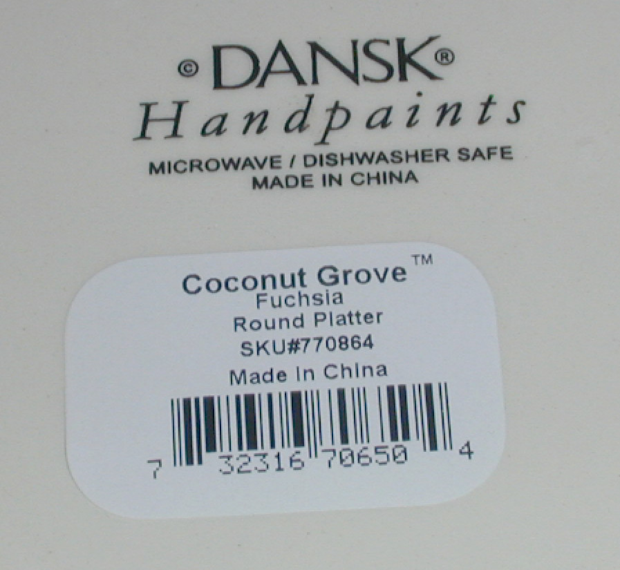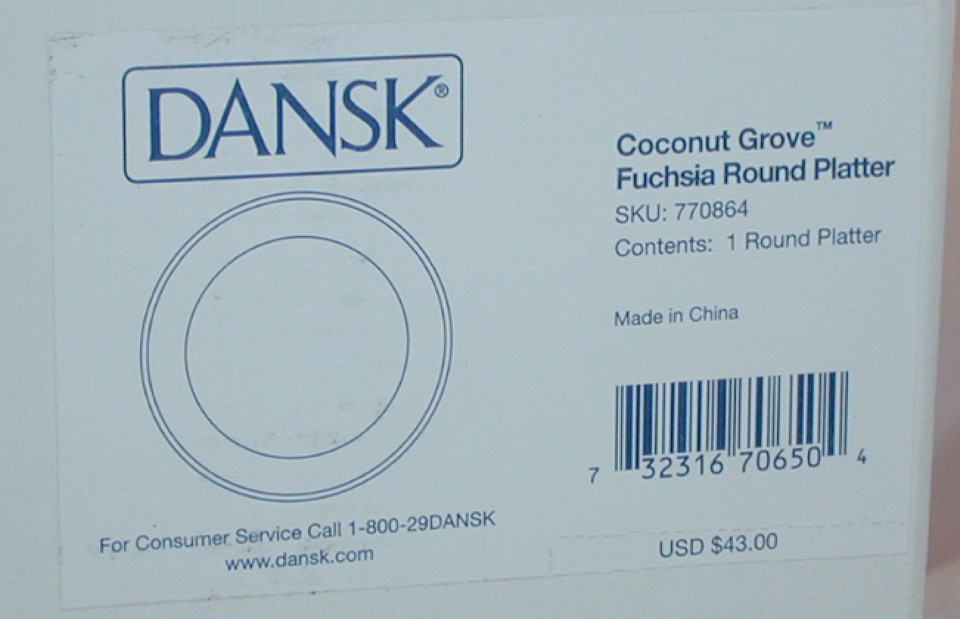 NEW IN BOX DANSK COCONUT GROVE FUCHSIA PLATTER DESCRIPTION: You are buying a brand new in original box DANSK FUCHSIA COCONUT GROVE. This attractive COCONUT GROVE FUCHSIA PLATTER will enhance any Holiday Decor or Table setting, use this to serve any thing from appetizers to dessert. The platter measures 14 1/2" in diameter and 1 1/2" high. Makes a great Hostess or Holiday Gift. New in Box Dansk Coconut Grove Fuchsia Platter Size: 14 1/2" x 1 1/2" SHIPPING: Please use the shipping calculator for shipping costs. I will ship using USPS tracking services. International Buyers ? Please Note: Import duties, taxes, and charges are not included in the item price or shipping cost. These charges are the buyer's responsibility. Please check with your country's customs office to determine what these additional costs will be prior to bidding or buying. ABOUT US: I have been selling on e-Bay for years, with thousands of satisfied customers due to the sales and service I provide. Visit my STORE: QUALITY-COLLECTIBLES-AND-STUFF. RETURN POLICY: Collectible returns must be packed carefully in original boxes with COA if applicable. Collectibles must be returned in as sent condition. Cosmetic items can only be returned in NEW UNUSED CONDITION. Products sold with manufacturers seals and boxed must be returned with seals intact along with the original box. Refunds will not be issued if the product can not be re-sold. A 20% restocking fee will be charged on any return. All Returns must be received back in the as sent condition.