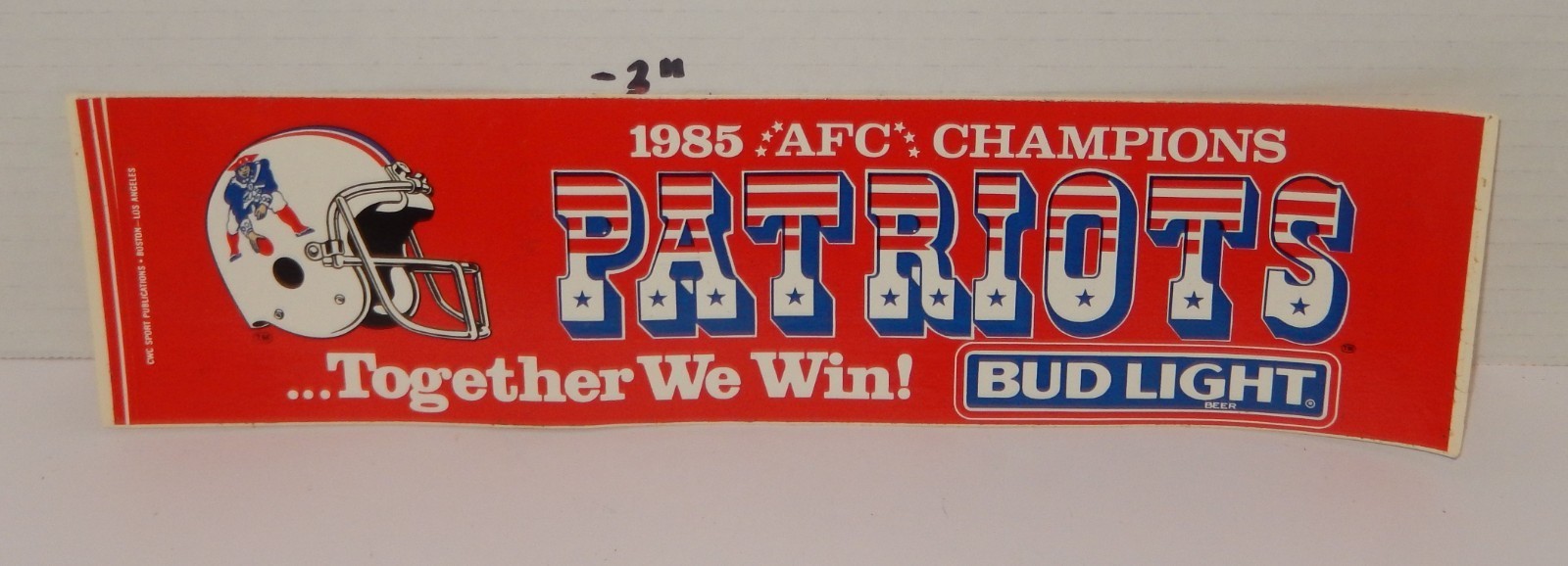 For Sale is a rare and hard to find New England Patriots 1985 AFC Champions Bumper Sticker NFL Football Red Blue. Its In Good USED Condition with Some Minor Handling wear as pictured. each additional bumper sticker after the first one purchased ships free. Please ask Any and All Questions prior to purchasing. Nice addition to any College Bowl Collection. Fast Same or Next day shipping with Free Delivery Confirmation within the U.S. Payment Due within 7 days of purchase (if you need more time please let us know In advance) we love to combine shipping is always a Yes and Most of the time Additional Items Ship for free.