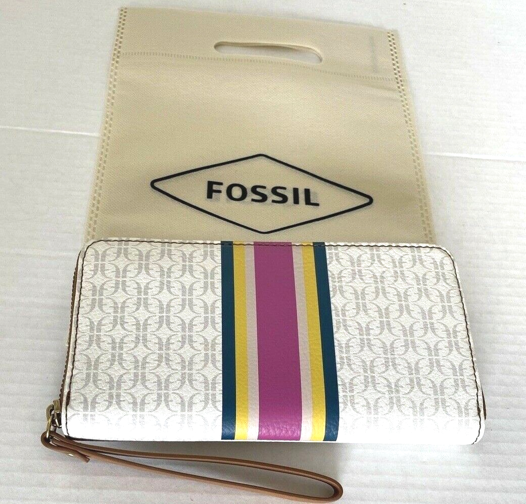 - New Fossil Jori zip clutch wristlet RFID wallet Pink Stripe with Dust bag