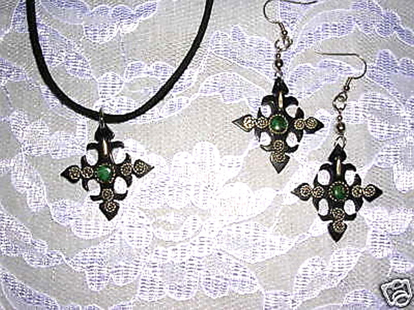 NEW HAND MADE BULL HORN WESTERN CROSS w SILVER & TURQUOISE NECKLACE & EARRINGS