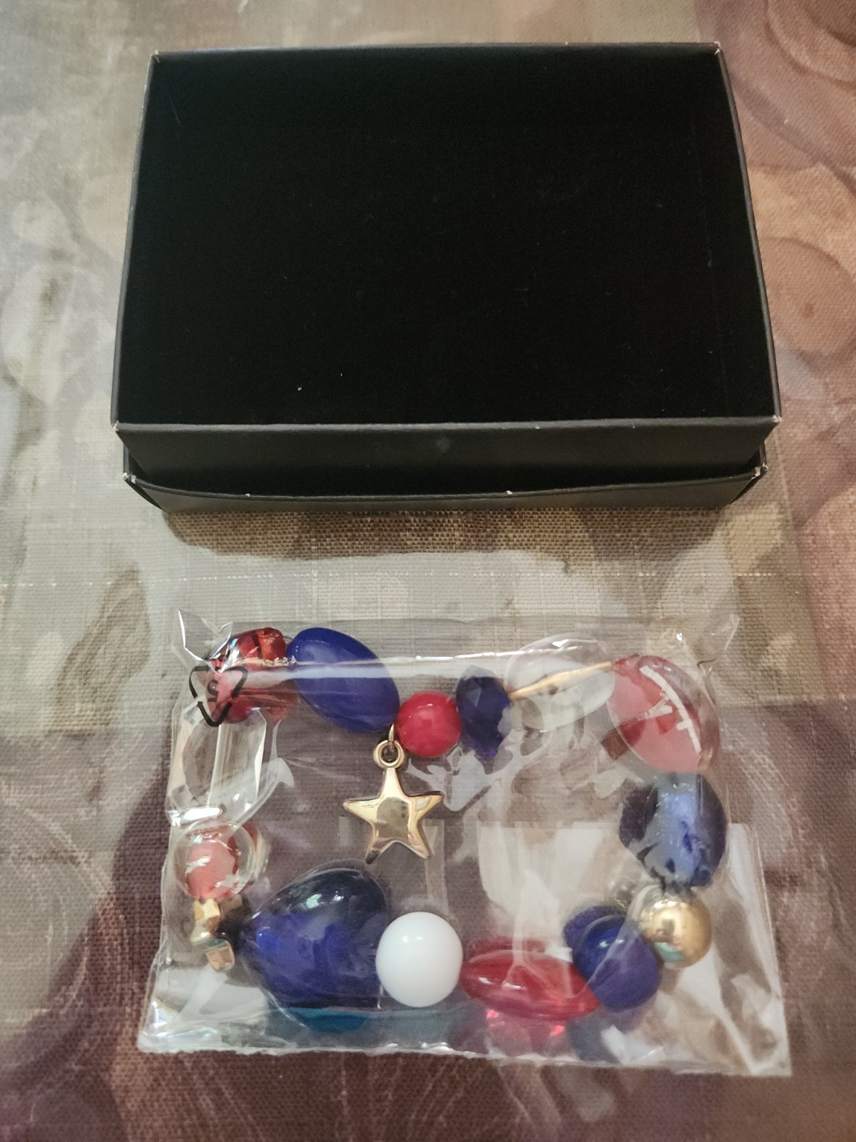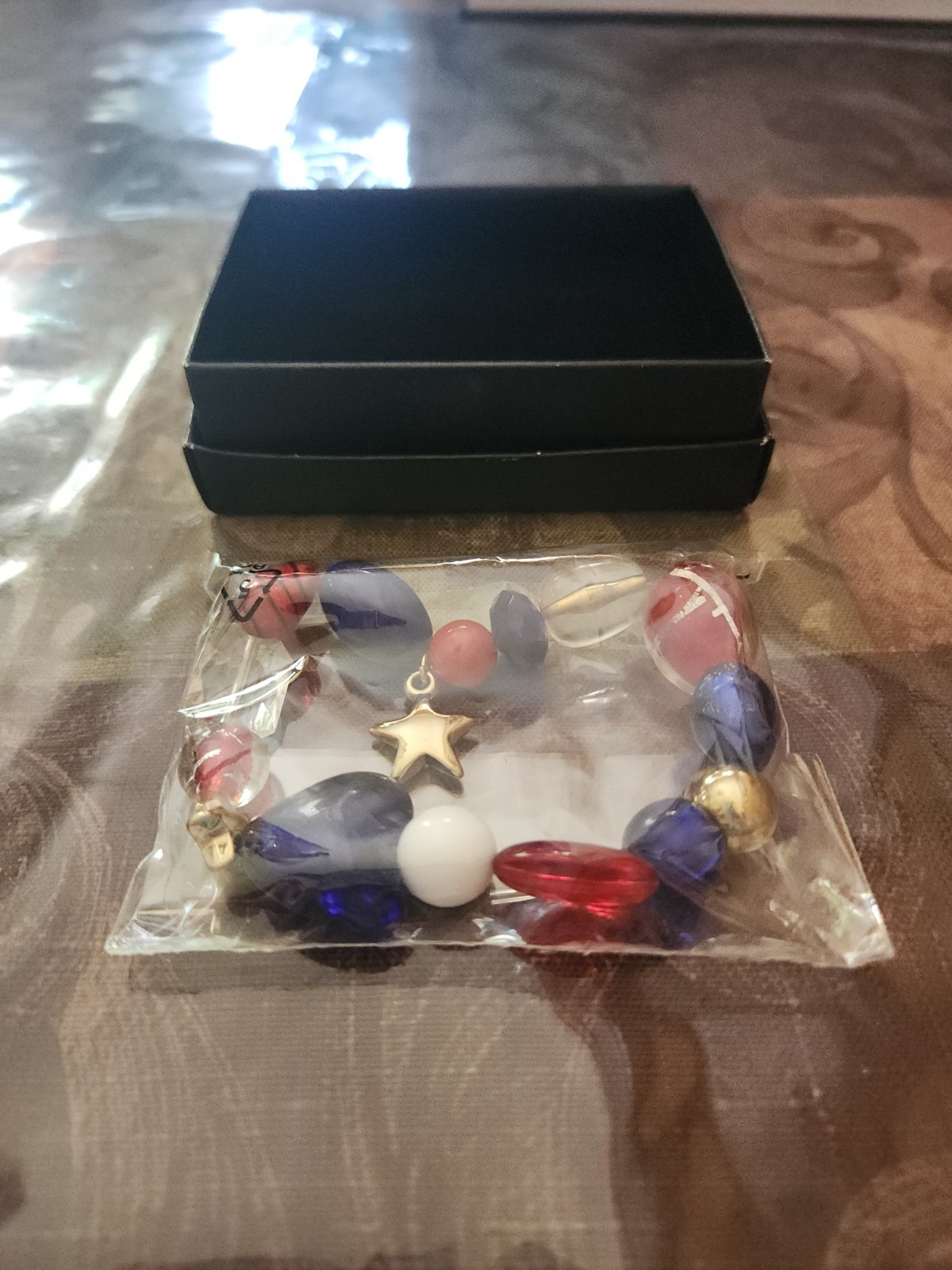New Murano Art Glass Blue Red Clear Beads Hearts Stars Charm Bracelet. Avon pretty patriotic bracelet that is sealed in original package. Never opened.