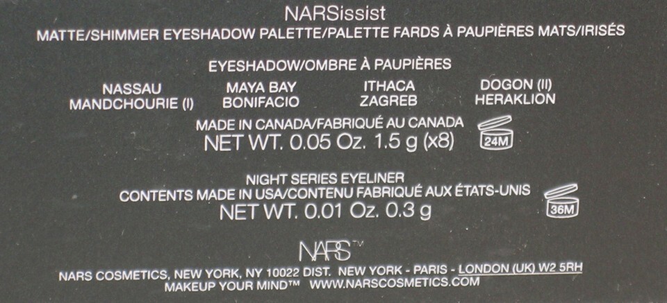 You are buying New Nars Narsissist eye shadow palettet #8310. This eye kit has 8 great shades that weight .04 oz / 1.3g (x8) for great looking eyes for matte and shimmer effects. One night series eyeliner pencil that weights 0.01 oz / .3g and the color is Night Clubbing. This complete eye kit will give you that great smoky eye look.