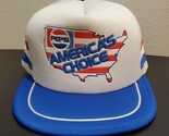 Beautiful Rare Vintage 1980s Pepsi America?s Choice Three 3 Stripe Mesh back / Snapback White / Blue / Red Trucker Hat - Men's One Size Fits All. New Old Stock / No Tags. The front patch has soft, raised detailed letters and it's a rare felt like material. Nice white braided piping on top of the hat's bill, also the bill is lightly padded. The foam padding inside the hat is perfect. Please See all Photos! ***It is slightly discolored from storage / age. Super hard to see.*** Will be shipped in a box for protection. SMOKE FREE HOME! SUPER FAST SHIPPING!