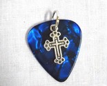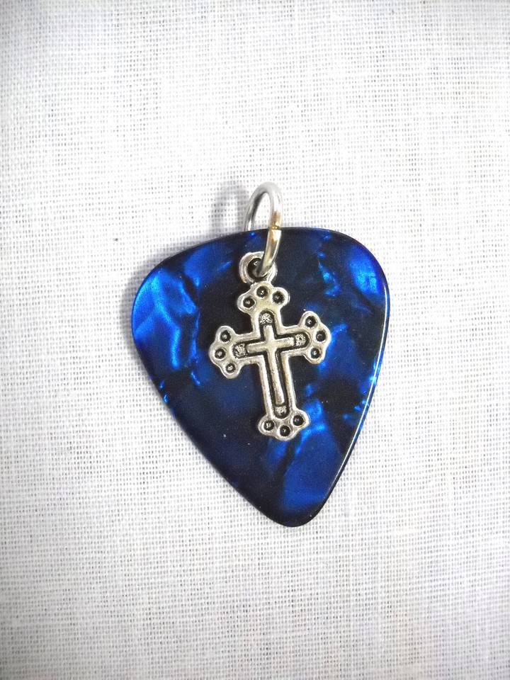 NEW DEEP RICH ROYAL BLUE CELLULOID GUITAR PICK WITH A ZINC ALLOY METAL CROSS CHARM DOUBLE PENDANT NECKLACE