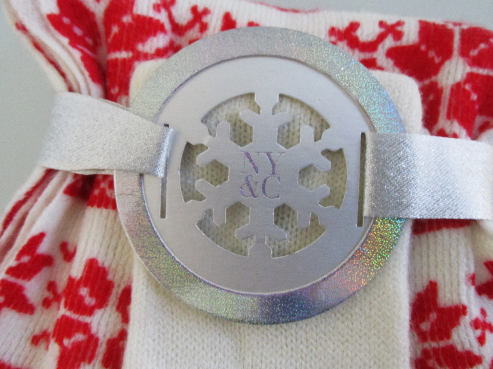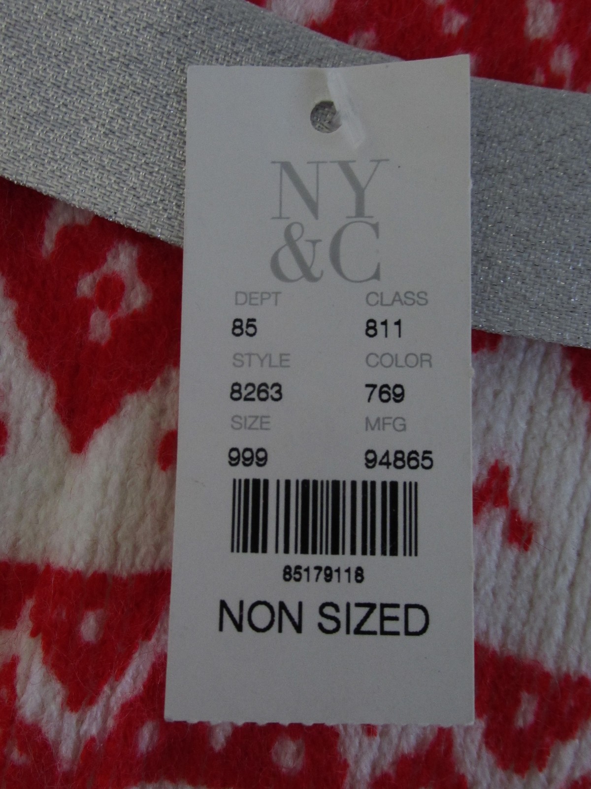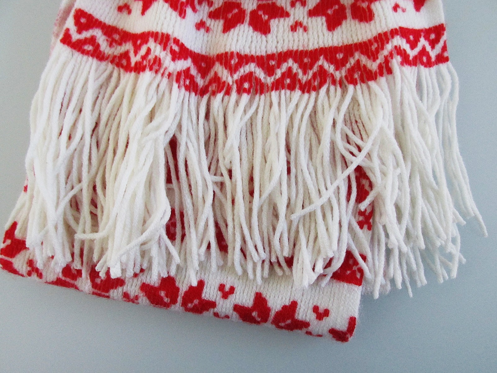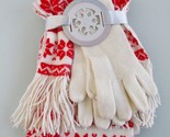 Description: Up for sale is a New York Co. scarf and glove set. The scarf has a red snowflake pattern on a white background with solid white gloves. The tie is made of 100% acrylic knit fabric. Dimensions are approximately 68" long x 7.50" wide. The scarf is accented with fringe ends.