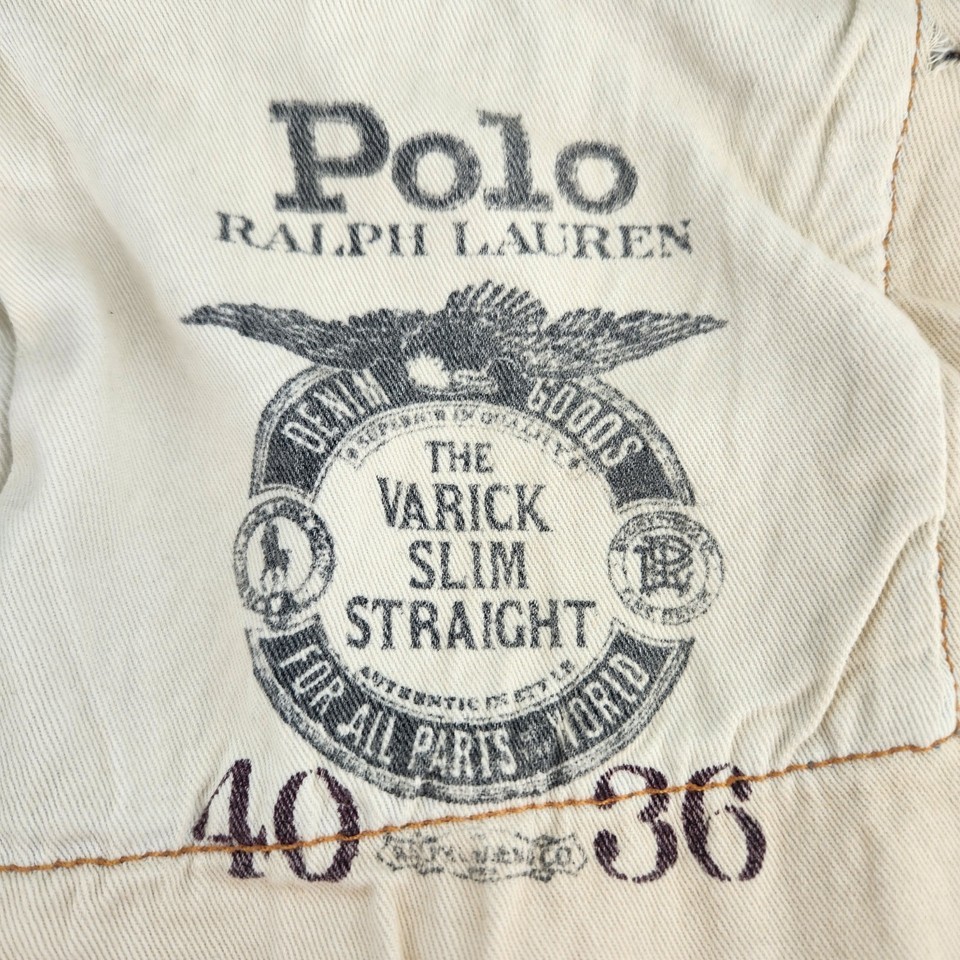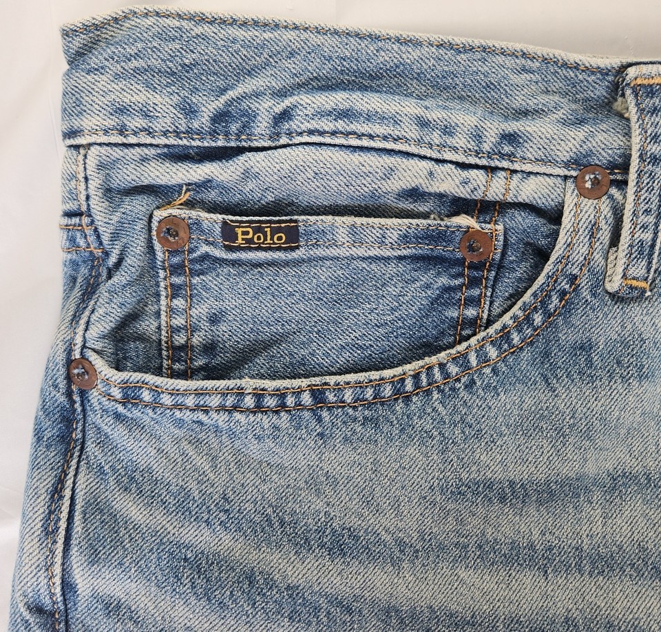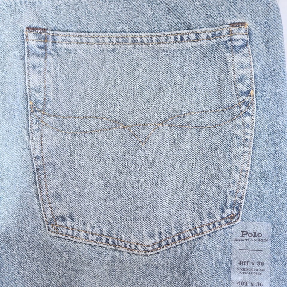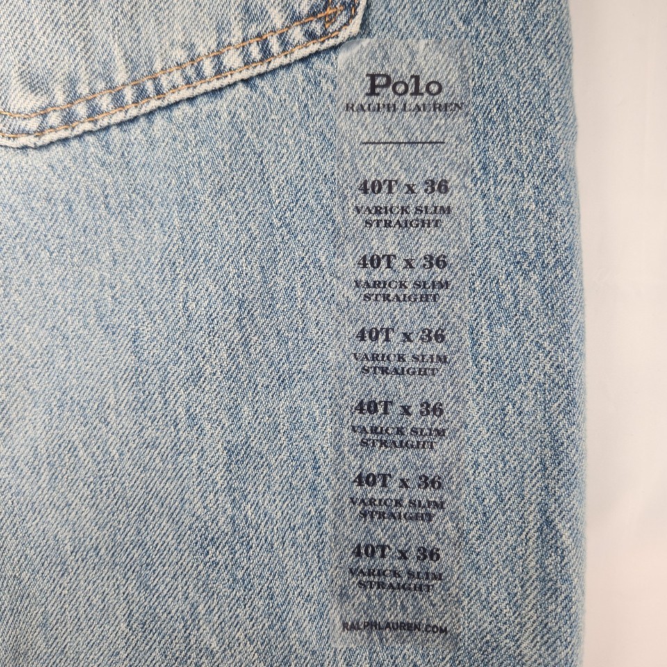 The product is a pair of Ralph Lauren Polo Varick Slim Straight Jeans in blue, size 40x36. These jeans feature a zip closure, high rise, and a 5-pocket design. Made of denim fabric with a light wash, they have a slim fit and are machine washable.