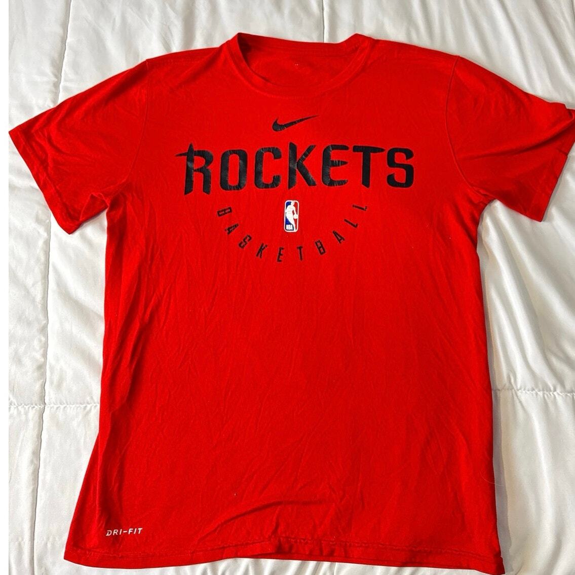 Show your team spirit with this official Nike Dri-Fit Houston Rockets Basketball T-shirt. Lightweight, breathable, and perfect for workouts or casual wear. Men?s Size: Large Color: Red with Black Rockets print Material: Dri-Fit Polyester Condition: Excellent pre-owned ? no stains, rips, or cracking on logo. Made for: Everyday wear or training sessions Features: Official NBA licensed product Moisture-wicking Dri-Fit technology Short sleeves Crewneck design