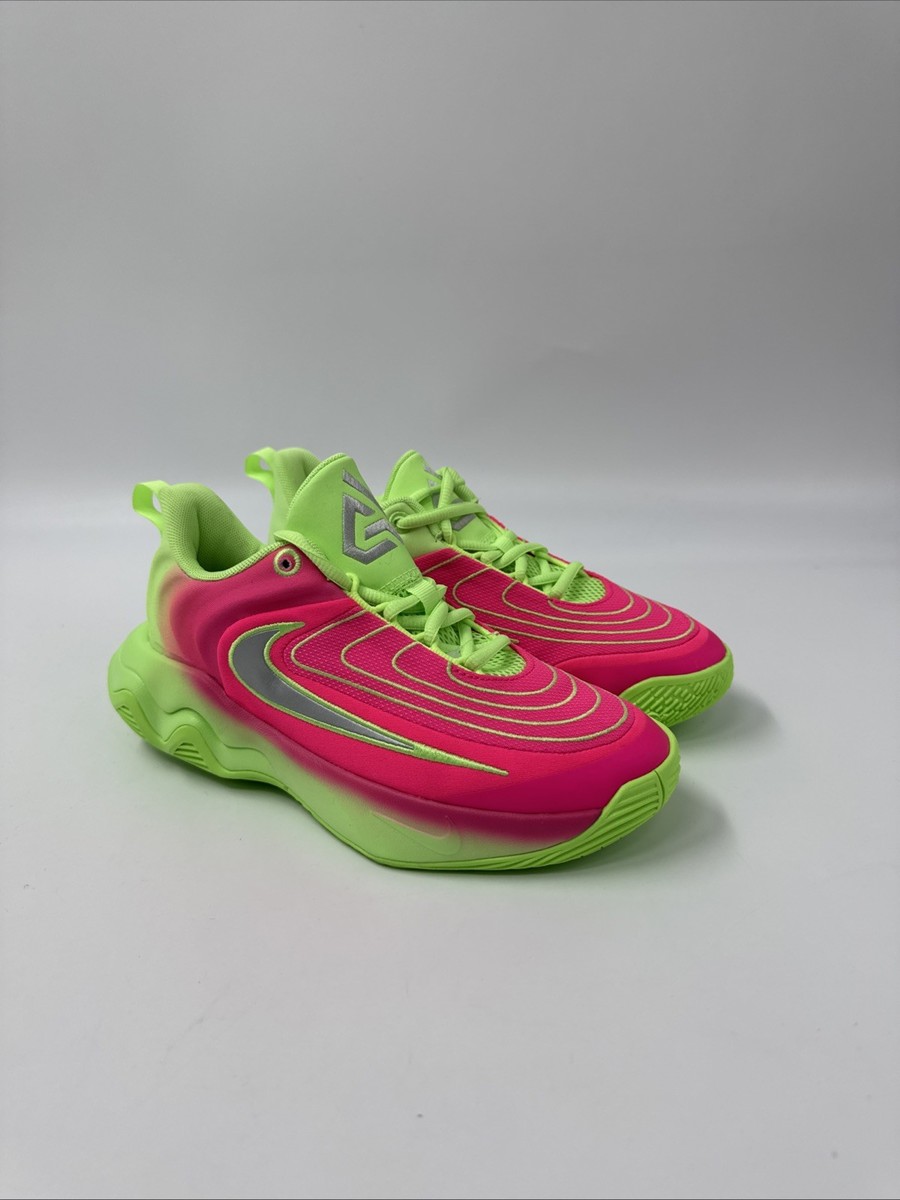 The Nike Giannis Immortality 4 Purple FZ6734-304 Men?s Size 3 sneakers are a stylish and comfortable choice for active boys. Featuring a round toe, lace-up closure, and rubber outsole, these shoes offer moderate cushioning and are perfect for various activities such as gym, walking, skateboarding, basketball, and running. The lime green and pink color scheme adds a fun and vibrant touch, while the moisture-wicking and water-resistant features make them suitable for all seasons. With the Nike Giannis Immortality product line and branded logo accents, these athletic sneakers combine style and functionality for young boys on the go.