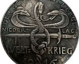 La moneta fantasy Nikitas Schickt Seine Tochter 1914 e una straordinaria medaglia commemorativa che cattura un momento significativo della storia. Il dritto della moneta presenta tre donne dal design elegante in stile antico, che rappresentano le figlie di Nikitas. I nomi incisi "Militza, Stana, Elena" fanno splendidamente riferimento a queste figure storiche, mentre l'anno "1914" segna l'inizio della prima guerra mondiale. Ricca di simbolismo e artigianalita, questa medaglia espone intricati rilievi che riflettono il significato culturale e storico dell'epoca. Il retro presenta un complesso design di tre serpenti intrecciati attorno a una spada, che simboleggia la sconfitta tedesca nella prima guerra mondiale, accompagnato dalla scritta "Der Schwarzen Berge Niederlage War 1916". Sebbene questo pezzo sia una riproduzione moderna, funge da sorprendente oggetto da collezione che racchiude gli intricati eventi storici e politici dell'inizio del XX secolo. Questa moneta fantasy unica non e solo una testimonianza dell'espressione artistica, ma anche un'aggiunta significativa per collezionisti e appassionati di storia.
