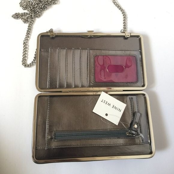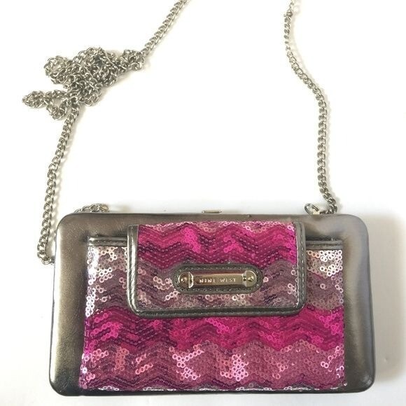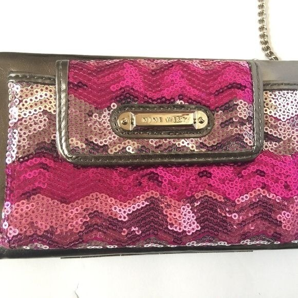Brand new with box and tags. Puffy hardcover pewter clutch wallet. Beautiful wavy pink sequined top. Organizer inside and chain strap, which fits inside the wallet.