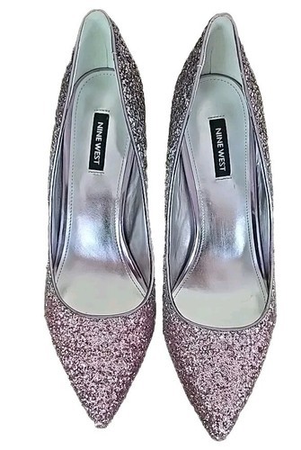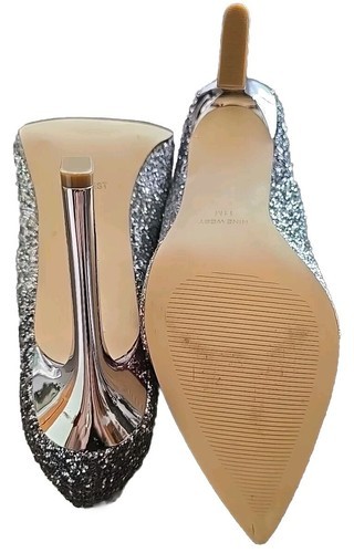 This Sale is for One (1) Pair of Nine West Shoes Women's Size 11M WNTRENDZP3 Gradient Glitter Pattern Solid ~ Shiny ~ Silver ~ Stiletto Heel measure approximately 4" tall Slip on shoes Pointed toe Padded foot-bed Sturdy design Shoes are in good ~ pre-owned condition Please view photos for a good description of these shoes Thank you!