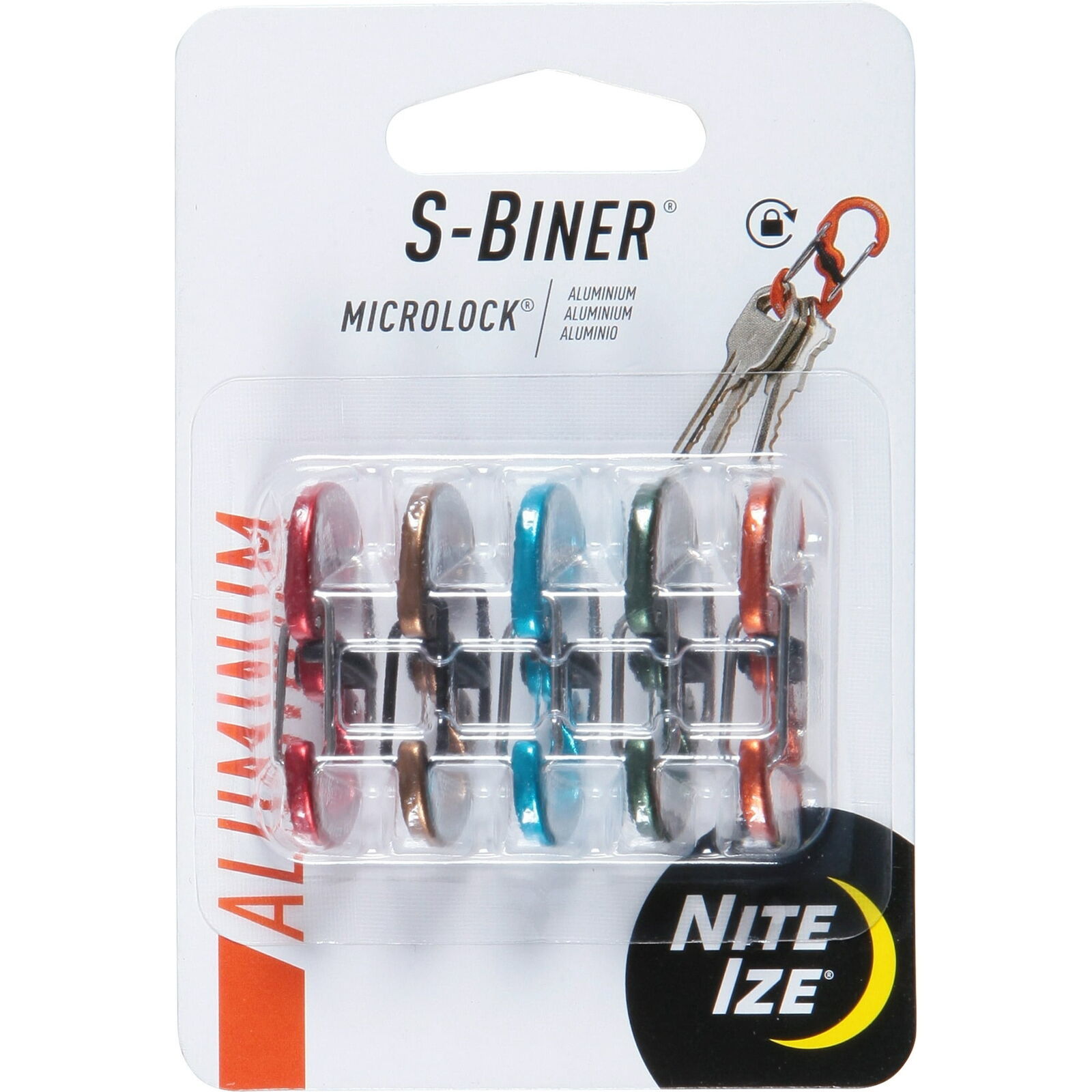 Nite Ize 5-Pack S-Biner MicroLock Aluminum Carabiner - Assorted 5 Pack, Mini S-Biner Micro Lock. Features a center locking lever, stainless-steel gates, and a colorful lightweight-aluminum body. These colorful S-Biners are the perfect size for holding, organizing, and identifying keys or other small items. The simple twist-to-lock lever keeps items in place, making this S-Biner versatile, convenient, and secure. Microlock, Aluminium, Assorted, 5 Pack Worry free guarantee. niteize.com. Packaging. Manufactured in China.