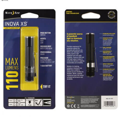 The INOVA XS features exceptional engineering in an unexpectedly compact, lightweight size. Powered by a single AAA alkaline battery (included), it has a patented optical system - precision-machined aluminum reflector with thermal interface - that provides superior light projection and visibility and boasts an impressive 110 Lumens. With an effective range of 137 feet, its beam is exceptionally powerful for such a compact flashlight. Its push button end-cap switch activates constant and momentary high and low modes. The stainless steel clip makes it a cinch to attach securely to a pocket or waistband and it's light enough to carry with you wherever you go.