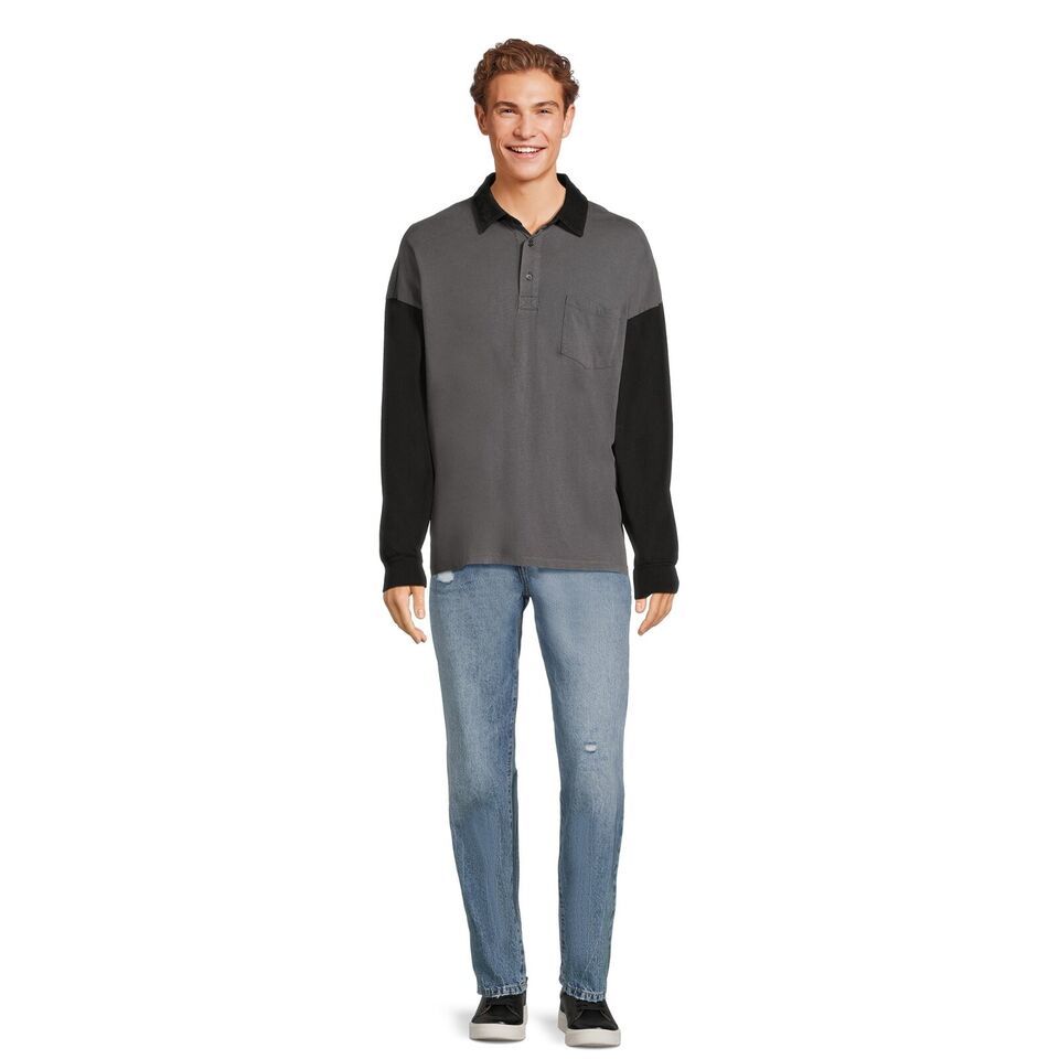 No Boundaries Men's Colorblocked Polo Shirt, Charcoal Sky Size XS(30-32) Hello, new favorite layer! No Boundaries? Long-Sleeve Polo Shirt for men is ideal for cooler months or chilly nights. Cozy and relaxed, this polo adds warmth without adding extra bulk, making it perfect to wear on its own or layered under a jacket for added coverage. Contrast tones at the collar and sleeves for a colorblocked design makes this casual shirt a top you?ll reach for again and again. Material: 100% Cotton Care: Machine washable Fit: Relaxed Collar: Spread Closure: Pullover style with button placket Sleeves: Long Pockets: Open chest pocket Features: Colorblocked design