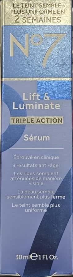 No7 Lift Luminate Triple Action Face Serum with Collagen Peptides, All Skin Types, 1 oz With No7 Lift Luminate facial serum, skin looks instantly more radiant and healthy; after 2 weeks skin looks younger, wrinkles appear visibly reduced, and skin tone looks more even* (*Consumer study of UK women) Formulated with a Vitamin C brightening complex and Matrixyl 3000+ to target fine lines and wrinkles, uneven skin tone, dark spots, pigmentation, and lack of firmness Anti-wrinkle serum is clinically proven to visibly leave skin more even looking and reduce the appearance of wrinkles 85% of women saw better age-defying results when adding No7 Lift Luminate serum to their skincare routine** 85% of women saw better age-defying results when adding No7 Restore Renew serum to their skincare routine** (**Consumer study of UK women over 8 weeks) With No7 Lift Luminate facial serum, skin looks instantly more radiant and healthy; after 2 weeks skin looks younger, wrinkles appear visibly reduced, and skin tone looks more even*