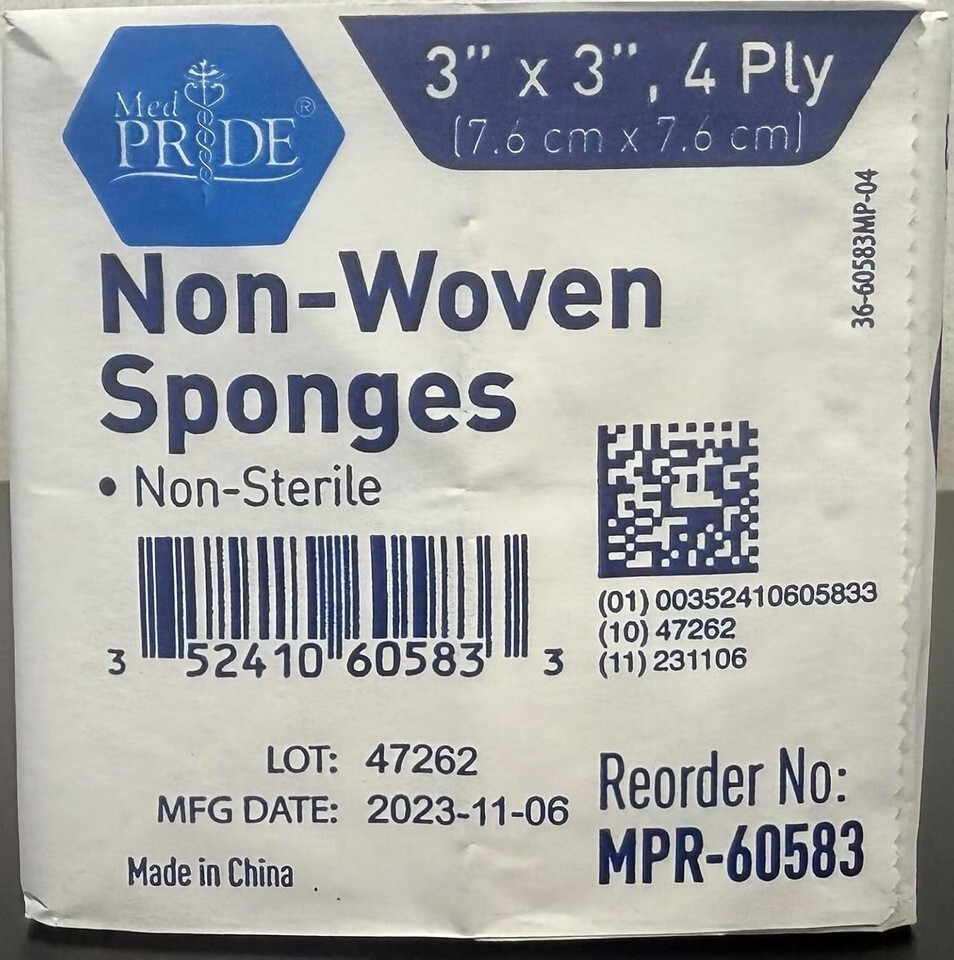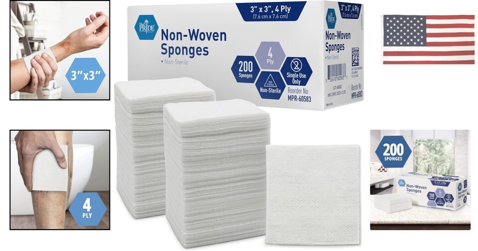 Non-Woven Non-Sterile Surgical Sponges, 200 Pack, 3in x 3in, 4-Ply Gauze Pads, Nonadherent Mesh, Absorbent Wound Dressing ? ? ? ? ? ? ? ? ? ? ? ? ? ? ? ? ? ? ? ? ? ? Non-Woven Non-Sterile Surgical Sponges -200 Pack -3in x 3in -4-Ply Gauze Pads -Nonadherent Mesh -Absorbent Wound Dressing Features: High absorbency essential for wound management and recovery. Designed to keep wound environment clean and reduce excess moisture. Non-adherent design minimizes trauma during dressing changes. Wide-ranging uses from minor cuts to larger surgical wounds. Bulk supply of 200 pads for convenience and peace of mind. Constructed to meet high standards of medical care. Benefits: Promotes faster healing with effective moisture control. Reduces pain and discomfort for patients during dressing changes. Valuable addition to any first aid kit for various injury types. Minimizes the need for frequent reordering. Assured quality for reliable wound care. Why choose our Non-Woven Non-Sterile Surgical Sponges? In the realm of wound care, the right tools can make all the difference. Our Non-Woven Non-Sterile Surgical Sponges are expertly crafted to provide outstanding absorbency while ensuring your wounds are kept clean and dry. The non-adherent mesh design minimizes discomfort during changes, allowing for seamless care. With a bulk pack of 200 pads, you will always have a trusted solution at your fingertips, protecting every healing journey. Rely on the quality of our gauze pads to bring peace of mind and effective recovery to your home, clinic, or first aid kit. Choose assurance, comfort, and efficiency as part of your wound care experience. Shipping Free Fast Shipping - We offer free shipping to most of the USA with a normal delivery time of 3-7 days. However, due to the current situation, additional delivery time (up to 3 weeks) may be required for some items. Alternative Carriers - We may use alternative carriers (e.g. USPS, FedEx, UPS, etc.) to ensure your package arrives safely and on time. Due to the use of multiple carriers, we are unable to provide a tracking number automatically. Handling Time - Orders are processed and shipped within 1-2 business days of receiving cleared payment. Shipping Restrictions - Shipping to Alaska, Hawaii, Puerto Rico, Guam, and other US territories may incur shipping charges or delivery restrictions. Please contact us before ordering, or your order can be refunded/cancelled. State Restrictions - There may be restrictions based on your state of purchase. For example, certain items may not be shipped to California due to state regulations. Contact for Tracking Updates - If you require tracking updates or have any concerns about the delivery of your order, please feel free to contact us, and we will be happy to assist you. Return 30-Day Hassle-Free Returns - We want you to be completely satisfied with your purchase. If you are not, you can return the item within 30 days of receiving it for a full refund or exchange. Easy Return Process - To start a return, simply contact us and we will provide you with a prepaid return shipping label and detailed instructions. Restocking Fee - There are no restocking fees for returns. However, the buyer is responsible for return shipping costs if the return is not due to a seller's error. Refund Processing Time - Refunds will be processed within 5 business days of receiving the returned item in its condition. Payment We accept all major credit cards, PayPal, and Apple Pay for your convenience. Your payment information is secure and encrypted to ensure a safe and seamless transaction. Please complete your payment within 3 days of purchase to avoid any delays in shipping. Feedback Your feedback is extremely important to us. We strive to provide the best products and customer service possible. If you are satisfied with your purchase, please take a moment to leave us a positive review. If you have any concerns or issues with your order, please contact us before leaving negative feedback. We are committed to resolving any problems and ensuring your satisfaction. Contact Us If you have any questions or concerns, please feel free to out to our customer support team. You can contact us through the messaging system. We are available Monday to Friday, 9:00 am to 5:00 pm EST, and we will do our best to respond to your inquiry within 24 hours. Buy it now and enjoy a pleasant shopping experience! Unit Quantity: 200 Style: Gauze Sterility Rating: Non-Sterile Material: Cotton Main Purpose: Emergency Treatment,Wound Care,Wound Healing Features: Hypoallergenic,Self-Adhesive,Water Resistant,Highly Absorbent,Non-Adherent Body Area: Abdomen,Arm,Back,Hand,Head,Jaw,Knee,Shoulder,Wrist,All Shape: Rectangle,Square Department: Adult,Unisex,Youth Type: Gauze Pad Color: White Size: 4x4 Inch (Pack of 200)