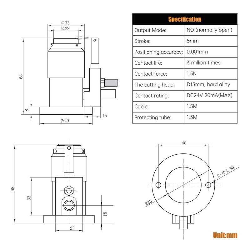 Output Mode NC (normally closed) Stroke 5mm Positioning accuracy 0.001mm (speed: 20-200mm/min) Contact life 3 million times Contact force 1.5N