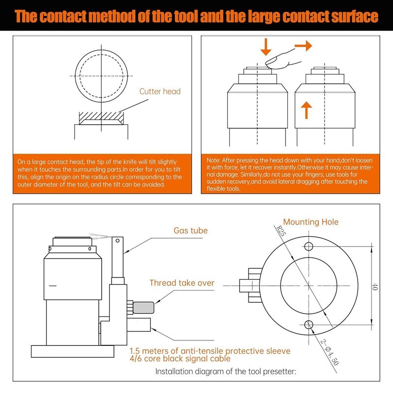 1. Try to install on the workbench where there is less iron filings and less splashing water. 2.Must be installed vertically, to ensure that the bottom is flat to avoid causing large precision errors. 3.Be sure to power off before installation. After the wiring is completed, place the tool setting tool in another place on the tool holder. After the tool signal is normal, fix the correct position.