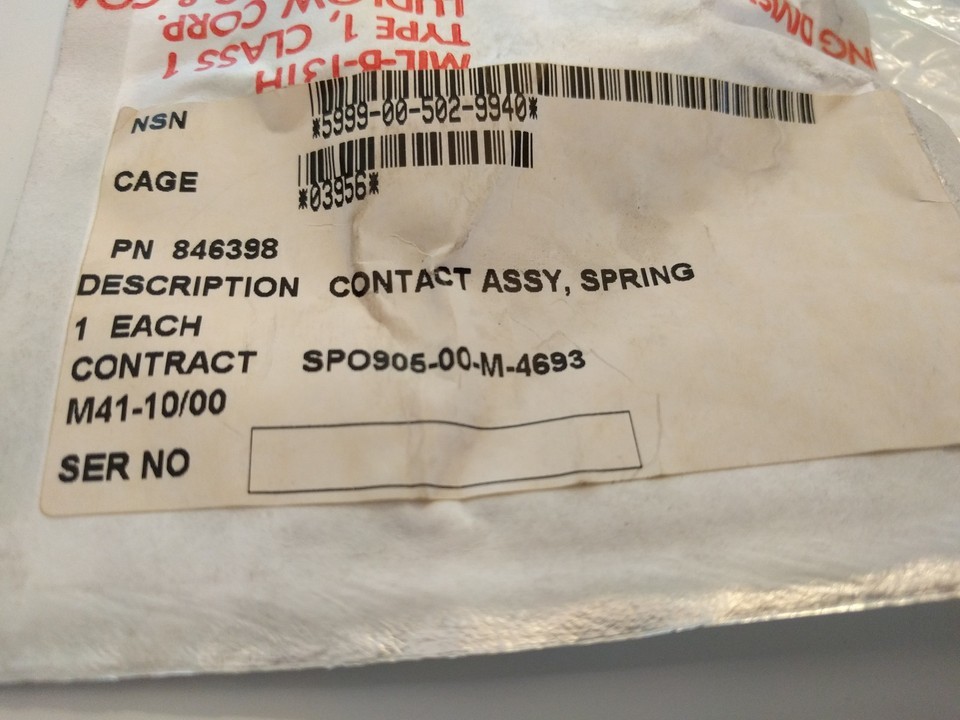 Northrup Aerospace Mil-Spec Rotary Switch Spring Contact Assbly Copper pn#- 846398 This was a good buy. This is a very specialized contact assembly. This is copper and multi level, perfect for your dial gage Switch. FREE USA SHIP